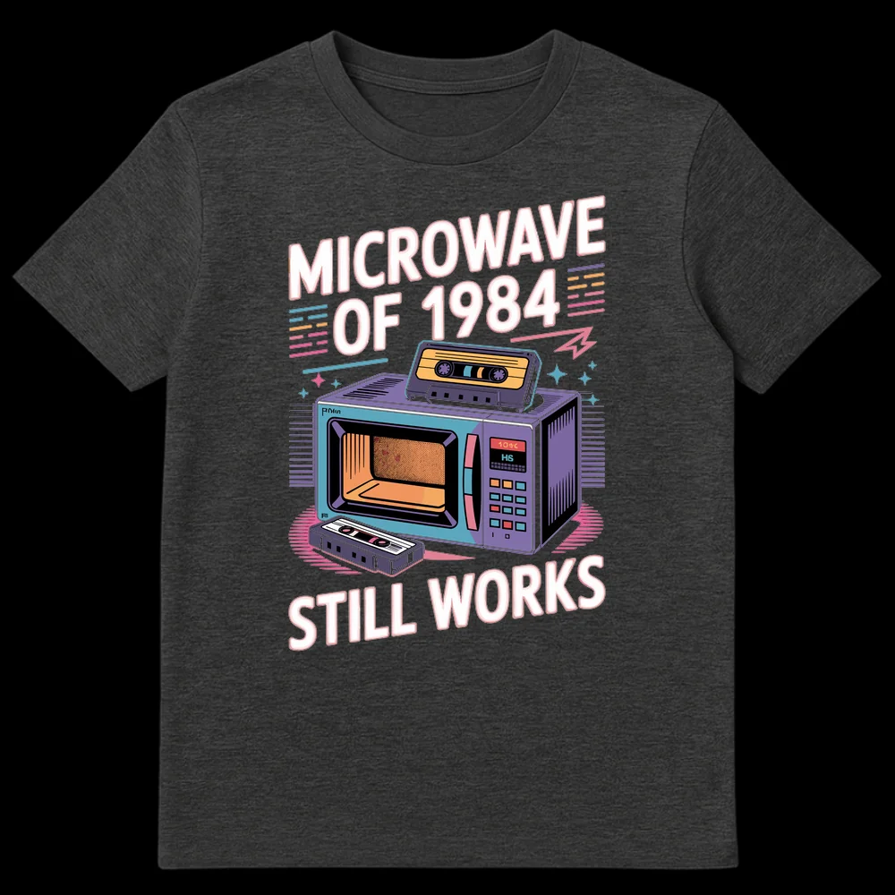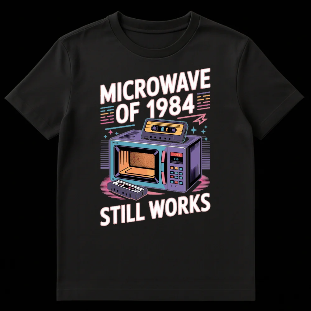 Celebrate the enduring quality of vintage electronics with our ‘MICROWAVE OF 1984 STILL WORKS’ tee. This design features a vibrant, retro 80s microwave, complete with cassette tapes, evoking pure nostalgia. It’s a humorous nod to a time when appliances were built to last, making it a perfect gift for anyone who appreciates classic tech and a good laugh. Wear your love for 80s pop culture with this unique graphic tee.