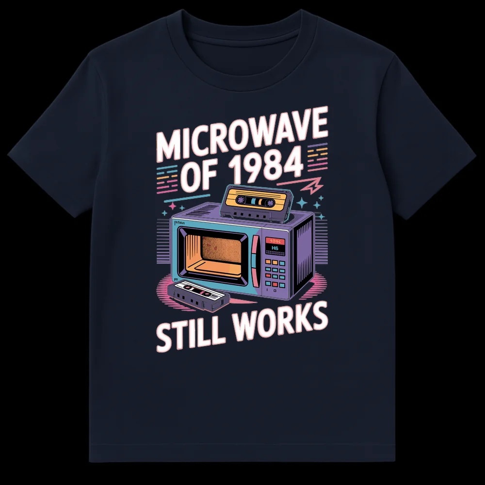 Step back in time with our ‘MICROWAVE OF 1984 STILL WORKS’ T-Shirt, a must-have for every 80s enthusiast and retro tech fan. This eye-catching design features a stylized, neon-accented microwave from the iconic year 1984, flanked by classic cassette tapes, all rendered in a vibrant synthwave aesthetic. The witty slogan playfully highlights the legendary durability of vintage electronics compared to modern gadgets, sparking smiles and conversation wherever you go. It’s more than just a shirt; it’s a wearable piece of pop culture history that celebrates the ‘they don’t make ’em like they used to’ sentiment. Perfect for Gen X, older Millennials, or younger fans of retro cool, this tee makes an excellent gift for birthdays, holidays, or just because they love the 80s.