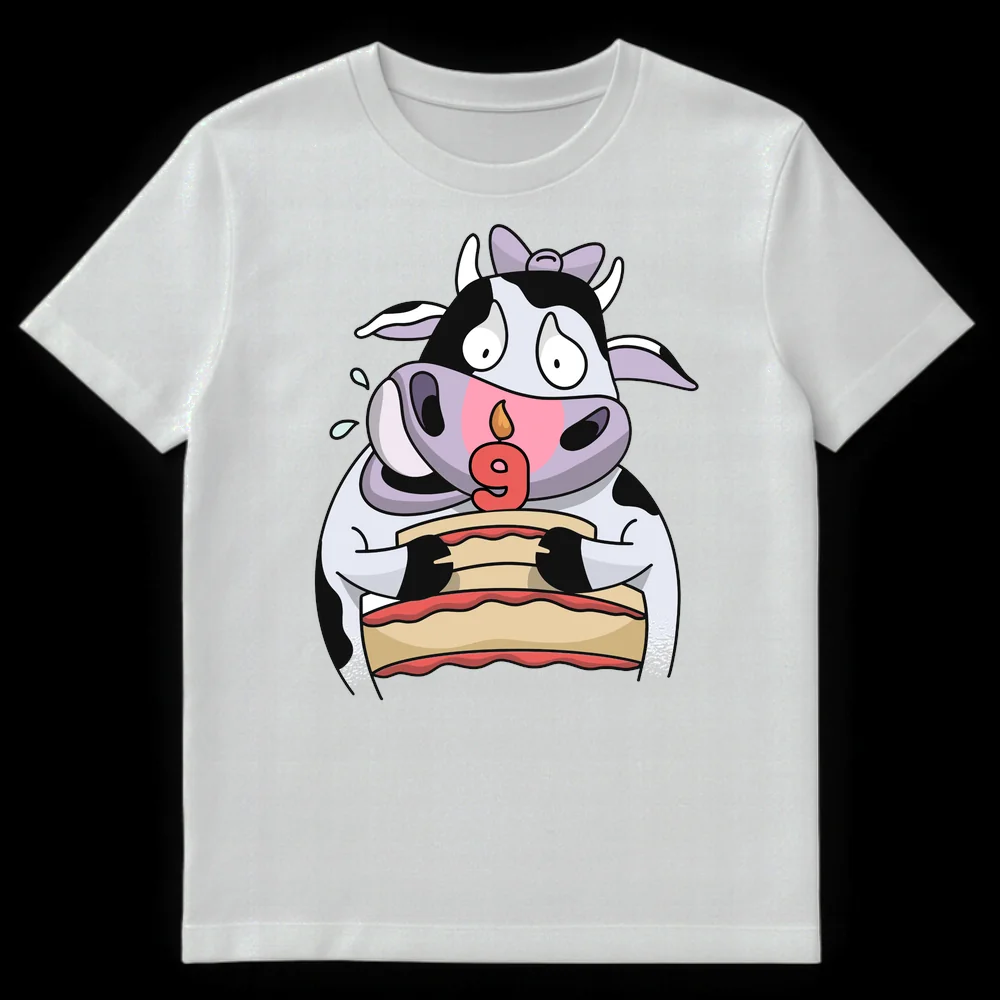 Celebrate turning nine with this adorable t-shirt featuring a joyful cartoon cow holding a birthday cake with a flaming ‘9’ candle. This design perfectly captures the excitement of a 9-year-old’s special day, complete with a delightful, slightly flustered expression. It’s the perfect birthday apparel or a memorable gift for any child or cow lover marking their 9th year.