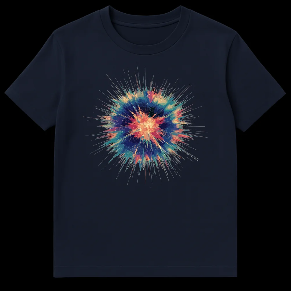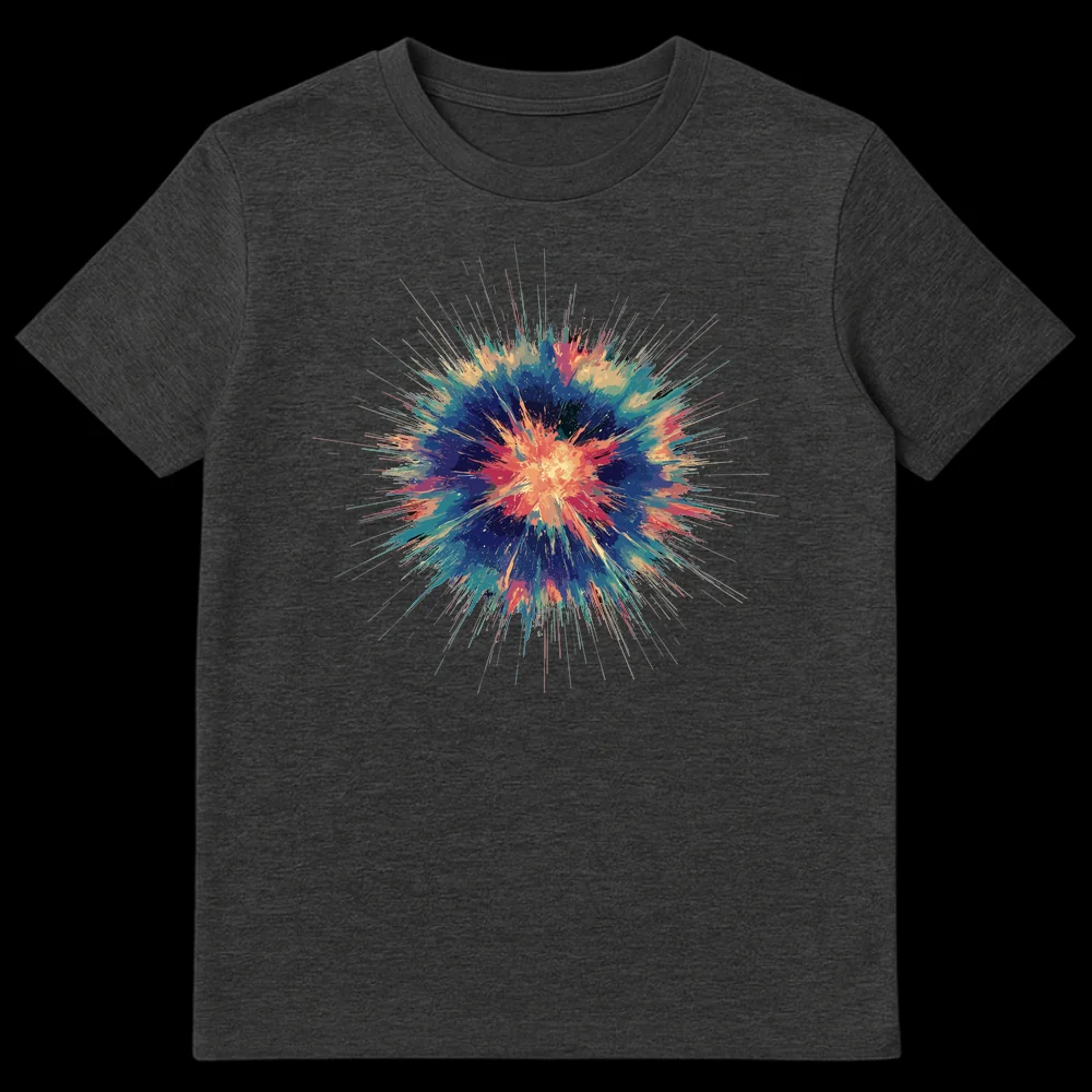 Experience wearable art with our captivating Abstract Cosmic Burst T-Shirt. This unique design brings an intense burst of multi-colored energy to life, featuring a central explosion of fiery oranges and reds that beautifully transition into cool blues, vibrant teals, and mysterious violets. The intricate, radiating lines and splattered digital paint effects create a dynamic visual that evokes powerful movement and excitement. Whether you see a supernova, a paint explosion, or a pure energy release, this tee is a statement piece. It’s perfect for individuals who gravitate towards modern abstract art, futuristic aesthetics, or simply love vibrant, eye-catching apparel. This gender-neutral design makes an excellent gift for teens and adults who want to express their unique style and passion for visually stunning art.