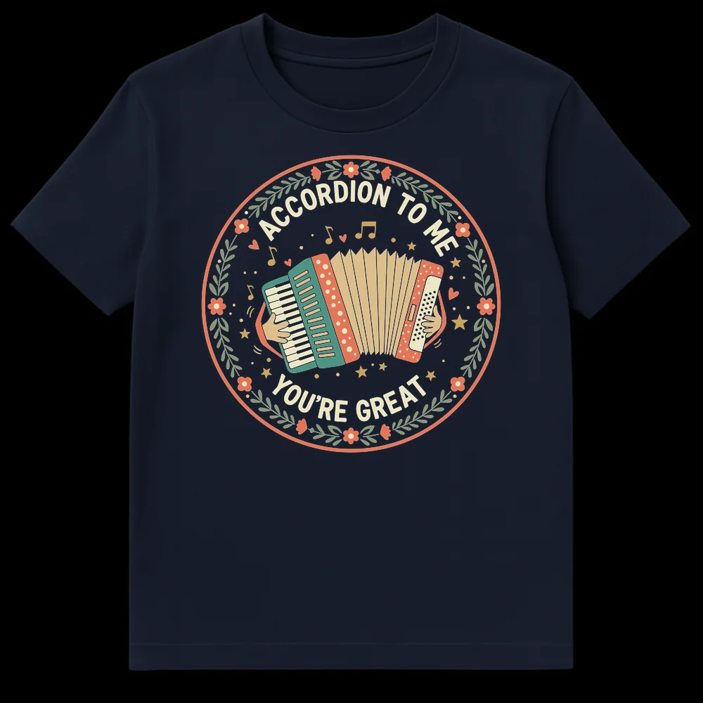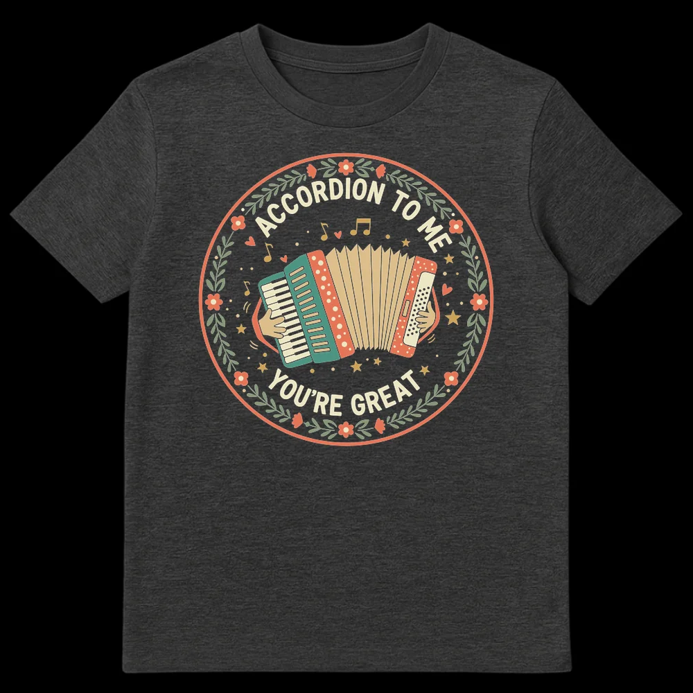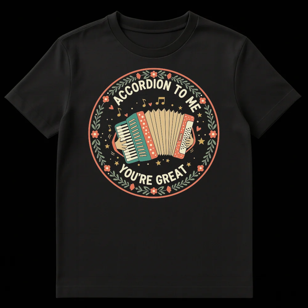 Celebrate music and positivity with our Accordion Lover tee! Featuring a charming, anthropomorphic accordion surrounded by a floral wreath, this shirt cleverly plays on the phrase “ACCORDION TO ME YOU’RE GREAT.” It’s a delightful pun that delivers a wholesome compliment, perfect for musicians, pun enthusiasts, or anyone who loves a feel-good, humorous statement.