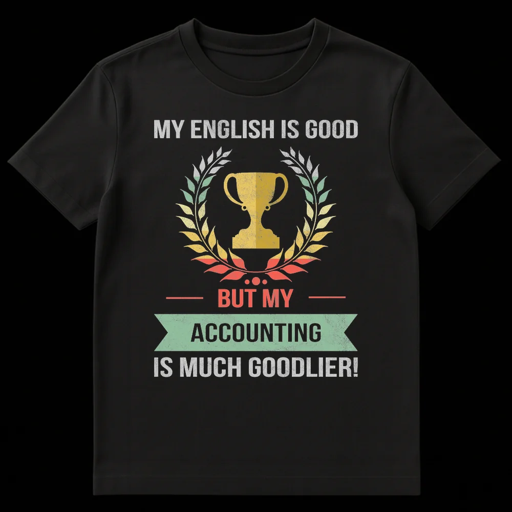 Celebrate your exceptional number skills with our ‘My English Is Good But My Accounting Is Much Goodlier!’ t-shirt. This unique design features a distressed retro-typography style, highlighting a stylized trophy and laurel wreath—symbols of achievement and excellence—all presented with a cool vintage aesthetic. The humor lies in the clever, self-deprecating pun, asserting your accounting brilliance with an ironically ‘goodlier’ twist on grammar. It’s a perfect conversation starter and a fun way to express pride in the often-underestimated world of finance. This shirt makes an ideal gift for accountants, finance students, bookkeepers, or anyone in the financial industry who understands the meticulous nature of their work and enjoys a smart, lighthearted joke. Wear your passion for precision and your sense of humor proudly!