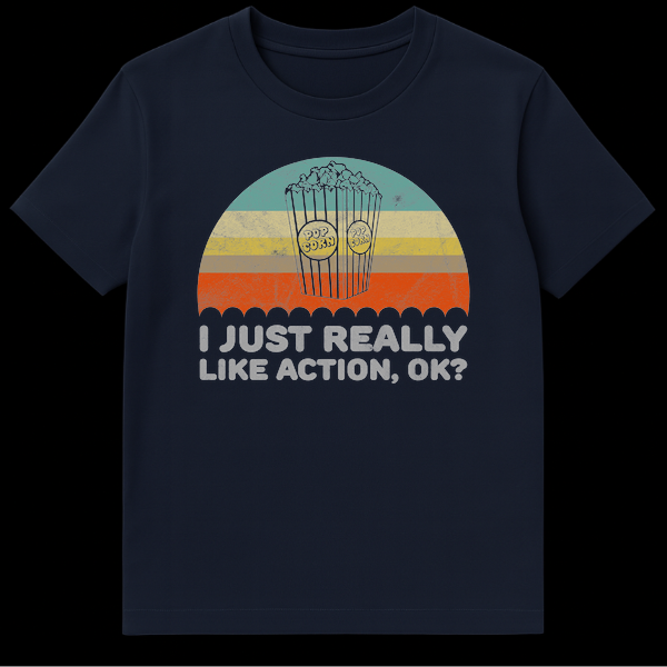 Declare your passion for high-octane entertainment with our ‘I JUST REALLY LIKE ACTION, OK?’ t-shirt. This design boasts a cool retro aesthetic, complete with a classic distressed popcorn bucket and a stylish semi-circular background in muted, vintage-inspired stripes. The text, “I JUST REALLY LIKE ACTION, OK?”, is a witty and relatable statement for anyone who finds comfort and excitement in the world of action films. It’s more than just a shirt; it’s a conversation starter and a tribute to cinematic thrills. Perfect for movie nights, film festivals, or casual wear, this tee makes a fantastic gift for action movie enthusiasts, film buffs, or anyone who just loves a good, explosive plot. Show off your film preference in a comfortably stylish way.