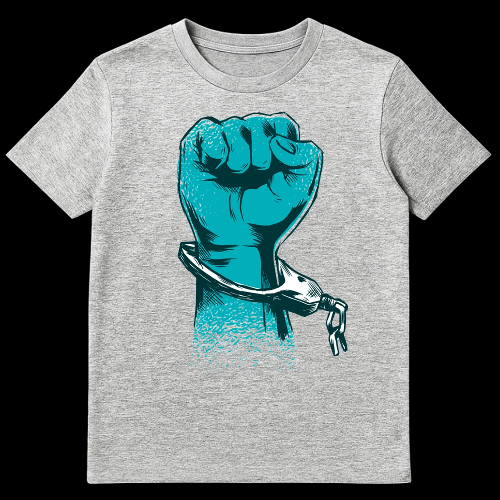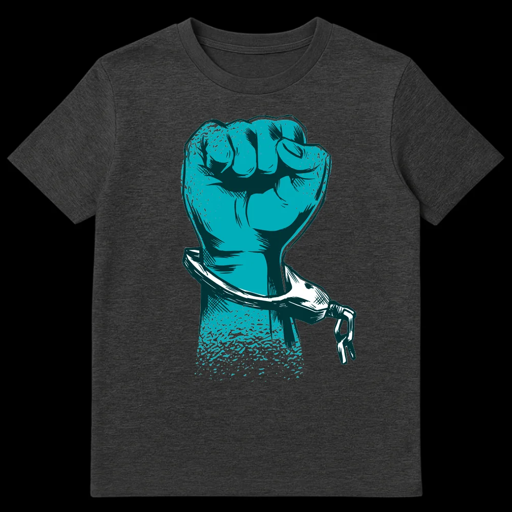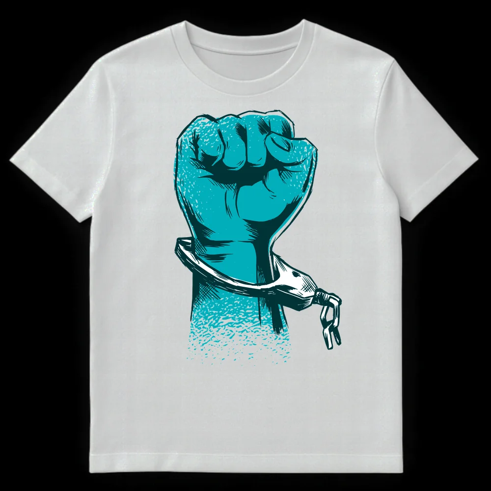 Unleash your voice with our powerful “Defiant Raised Fist” t-shirt, symbolizing breaking free from oppression. This striking design features a textured, grunge-style raised fist shattering open handcuffs, perfect for anyone passionate about social justice and human rights. It’s an ideal gift for activists, advocates, or anyone who stands for freedom and empowerment.