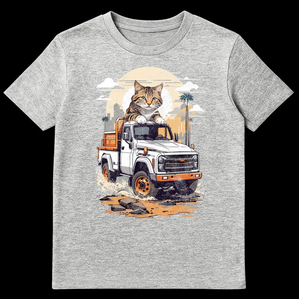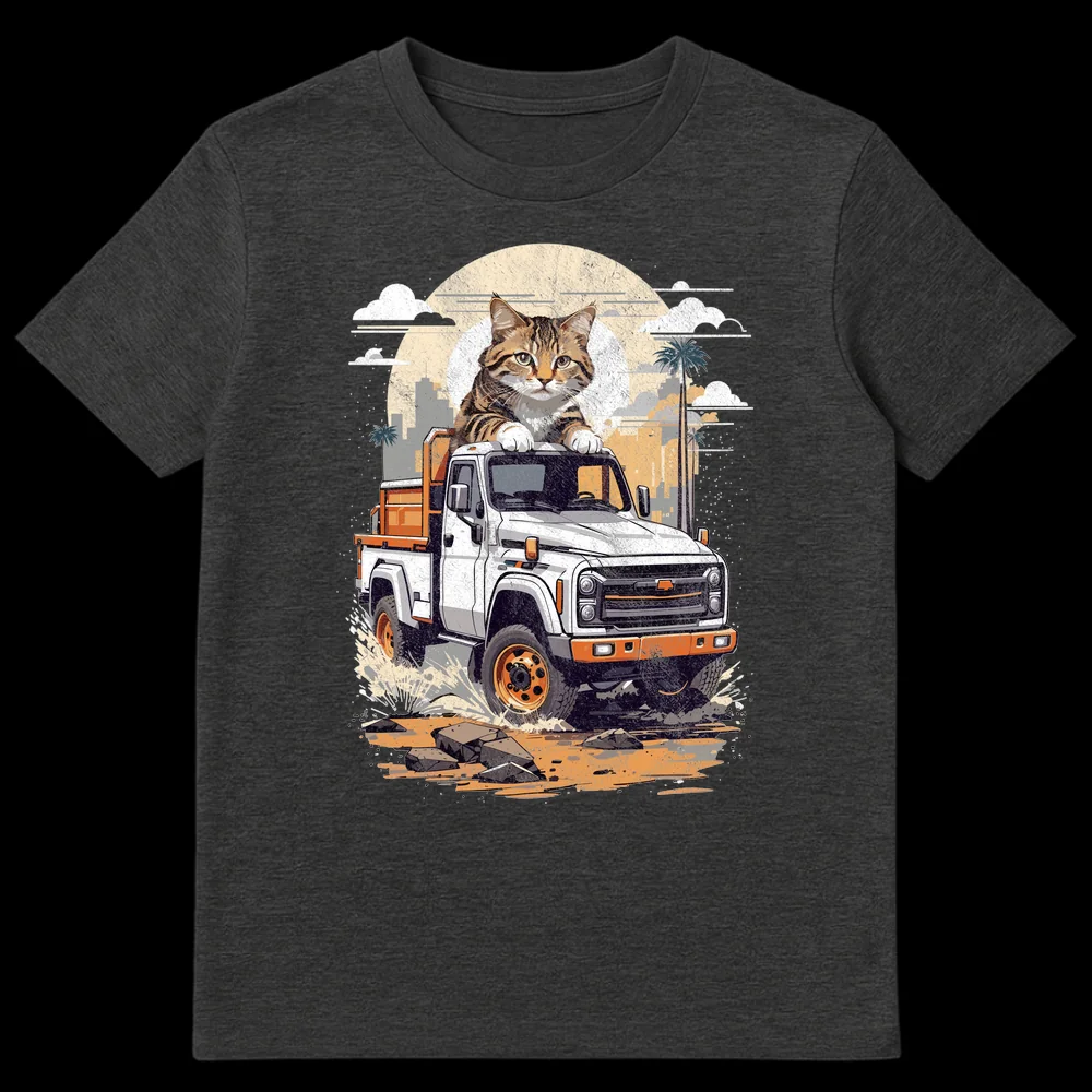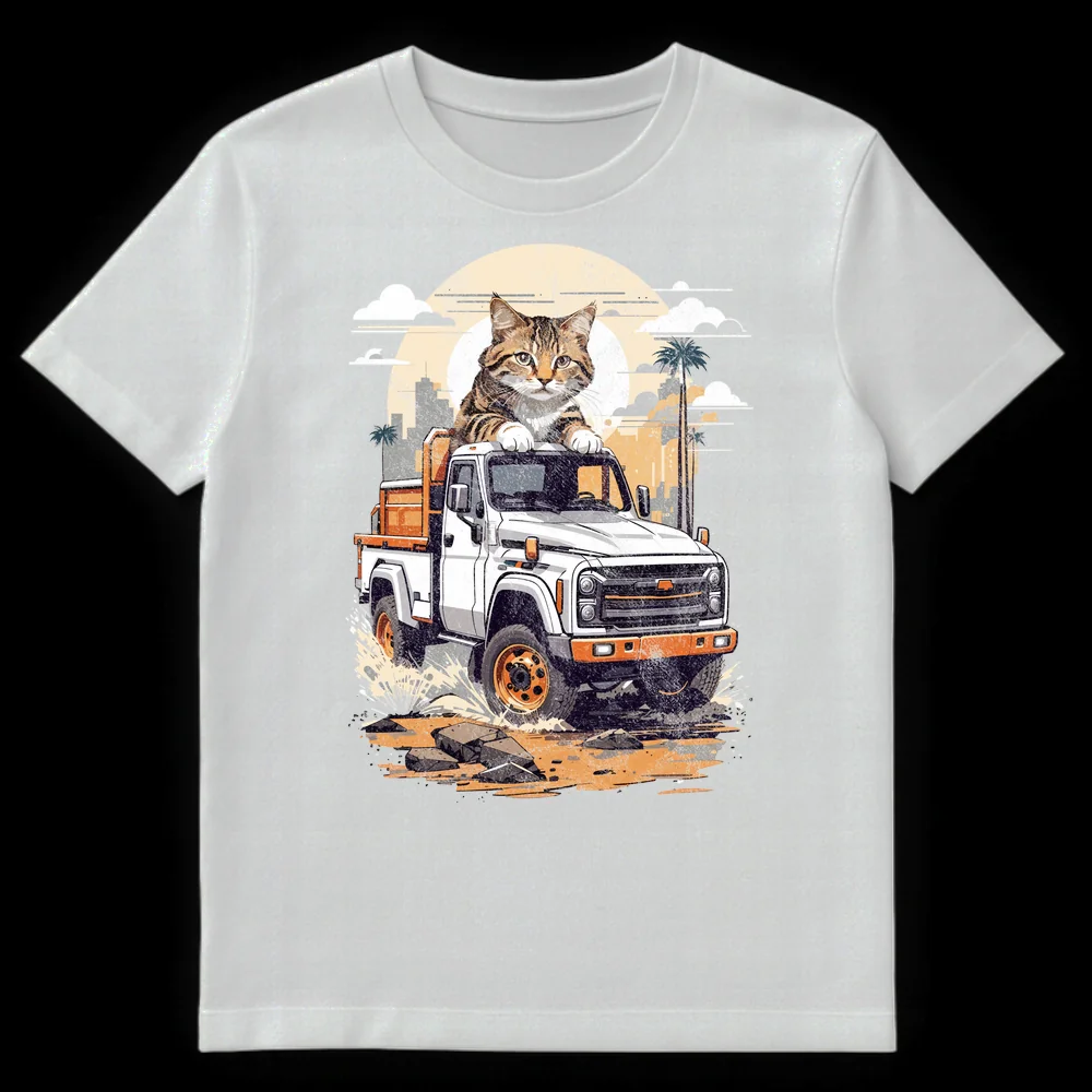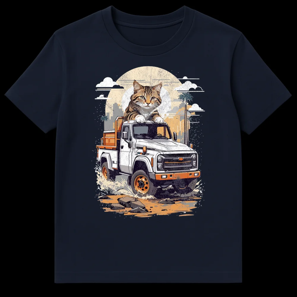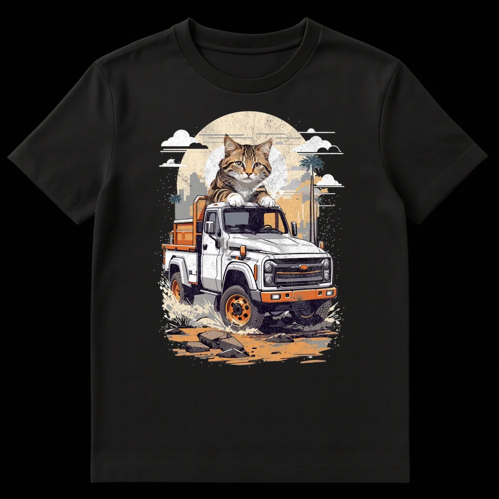 Unleash your inner adventurer with this captivating t-shirt, showcasing a powerful tabby cat fearlessly perched atop a classic, rugged 4×4 pickup truck. Our ‘King of the Road’ design masterfully blends detailed feline realism with a retro-futuristic, distressed graphic novel aesthetic, creating a truly unique and memorable piece. The truck is depicted in dynamic motion, kicking up dirt against a stylized backdrop of a moonlit city and palm trees, symbolizing an epic journey. This shirt doesn’t just feature a cat; it celebrates the whimsical idea of a feline explorer, a playful nod to the independent, sometimes imperious nature of our beloved pets. Perfect for cat owners who see their furry friends as royalty, classic truck aficionados, or anyone who appreciates a design that combines rugged charm with delightful fantasy. It’s an excellent gift for birthdays, holidays, or any occasion to surprise a cat lover or a truck enthusiast with a truly special garment. Stand out from the crowd and express your love for cats and adventure with this cool, conversation-starting tee.
