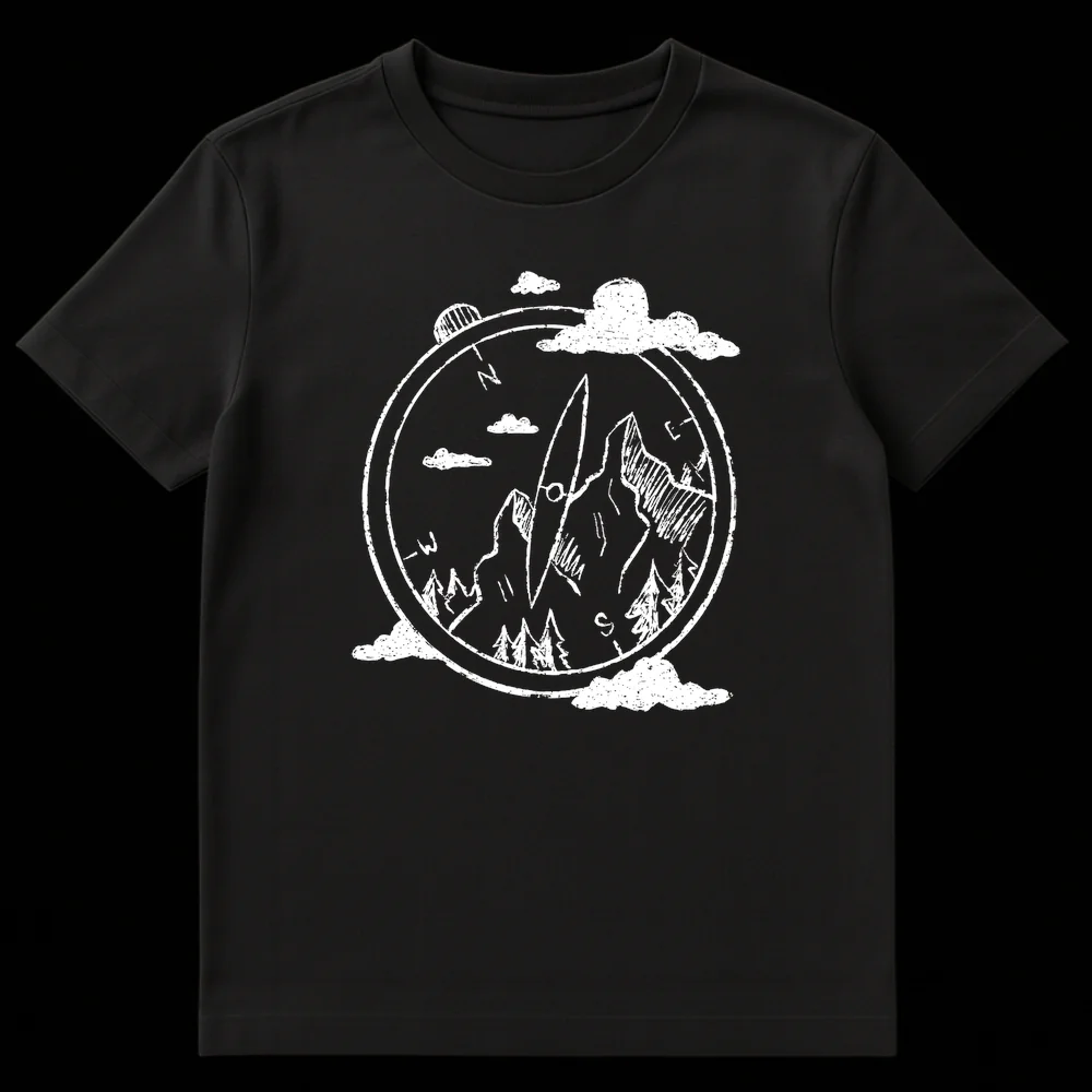 Journey through the wilderness with our ‘Mountain Compass Direction’ t-shirt, a tribute to exploration and the beauty of nature. This design features a beautifully rendered, rustic-style compass, prominently displaying N, E, S, and -W, overlaid on a rugged mountain range with dense pine forests and a celestial element. Crafted with a hand-drawn aesthetic, it captures the raw, spontaneous feel of chalk art. More than just clothing, it’s a wearable piece of wanderlust, inspiring dreams of adventure and connection to the wild. Perfect for hikers, campers, travelers, or anyone seeking their own path, this shirt is an ideal gift for the nature enthusiast in your life, symbolizing guidance, freedom, and the call of the wild.