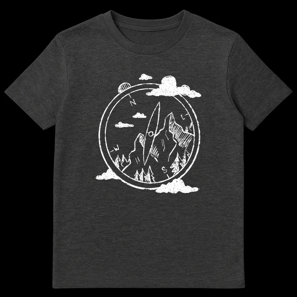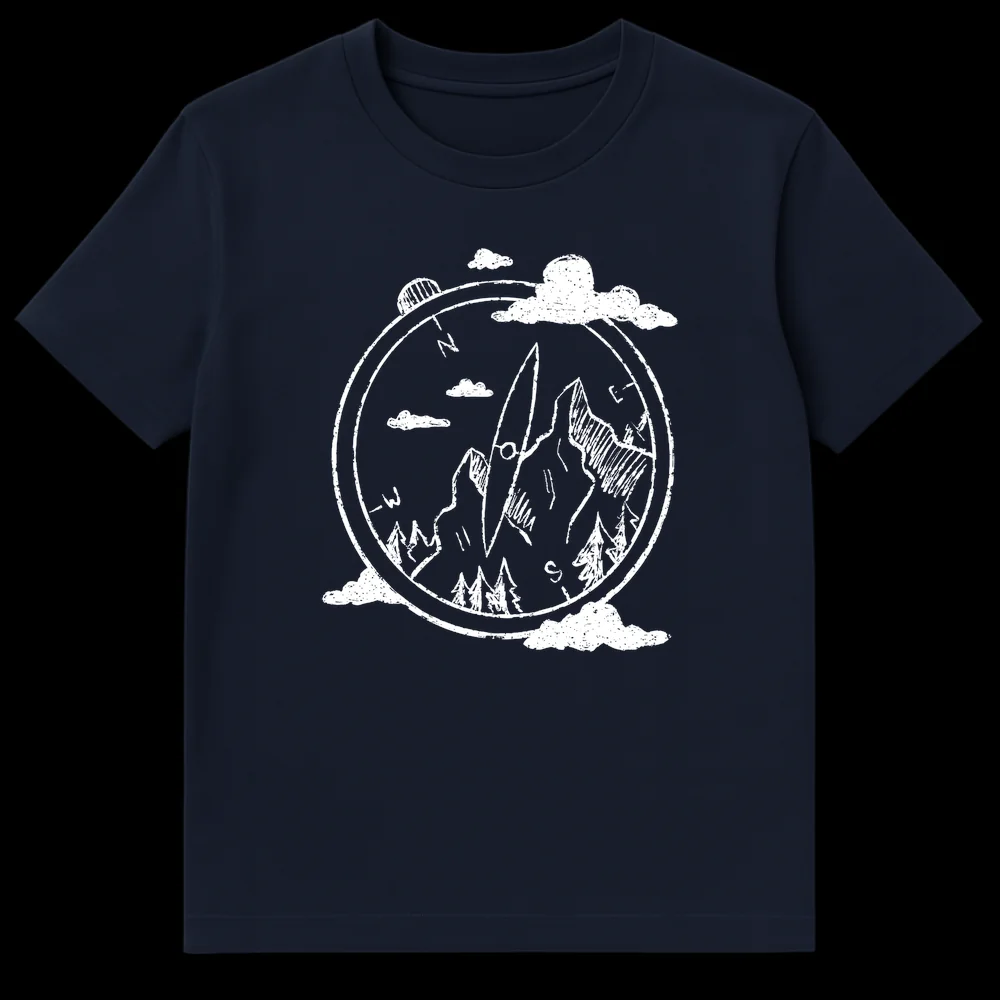 Embrace your inner explorer with this captivating t-shirt, featuring a hand-drawn compass guiding you through a serene mountain and forest landscape. The iconic N, E, S, -W directional points evoke a sense of journey and purpose. This unique design celebrates nature, adventure, and finding your true north, making it a perfect gift for hikers, campers, and anyone who loves the great outdoors.