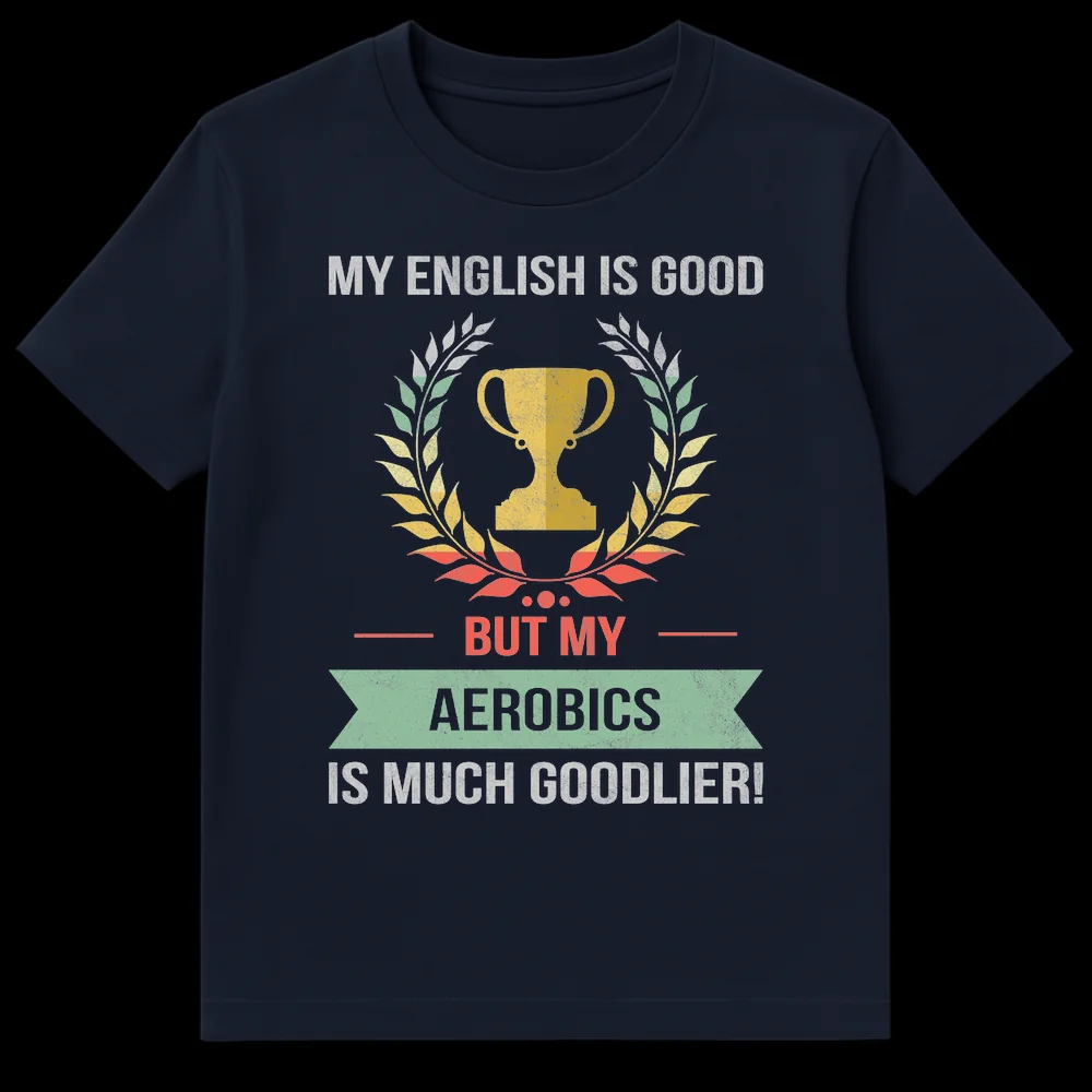 Show off your passion for fitness with this humorous “My English is good, but my Aerobics is much goodlier!” t-shirt. Featuring distressed retro typography, a trophy, and a laurel wreath, it celebrates your superior aerobics skills with a witty, self-aware grammatical twist. This unique tee is a perfect gift for aerobics instructors, fitness buffs, or anyone who appreciates a clever linguistic joke.