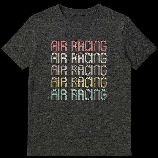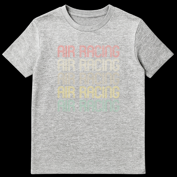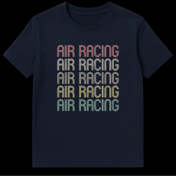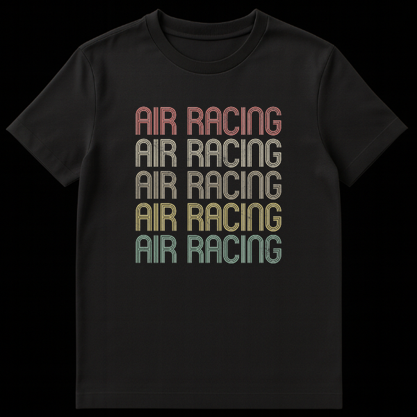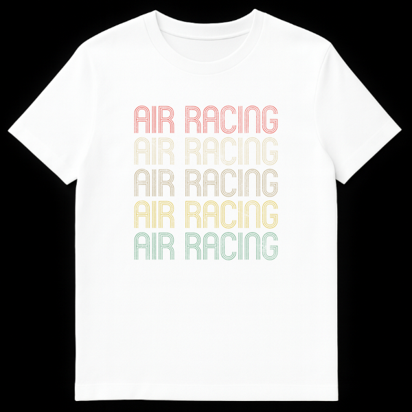 Embrace the thrill of the skies with our “AIR RACING” t-shirt, featuring the iconic phrase stacked five times in a captivating, retro-inspired color palette. Each line boasts a distressed texture and multi-line font, evoking a classic, high-speed aviation aesthetic. This unique design is perfect for air racing enthusiasts, pilots, and anyone who appreciates a bold, nostalgic sports look, making it an excellent gift for aviation lovers.