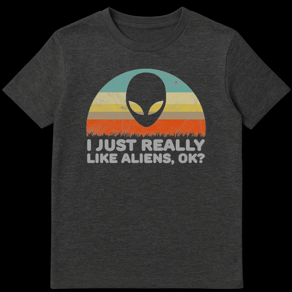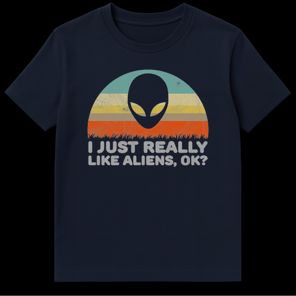 Embrace your extraterrestrial affection with this whimsical retro alien t-shirt! Featuring a unique vintage-style striped background and a classic alien silhouette, this design proudly declares, “I JUST REALLY LIKE ALIENS, OK?”. It’s the perfect humorous statement piece for anyone who has a soft spot for visitors from another world and makes an ideal gift for UFO enthusiasts and sci-fi fans.