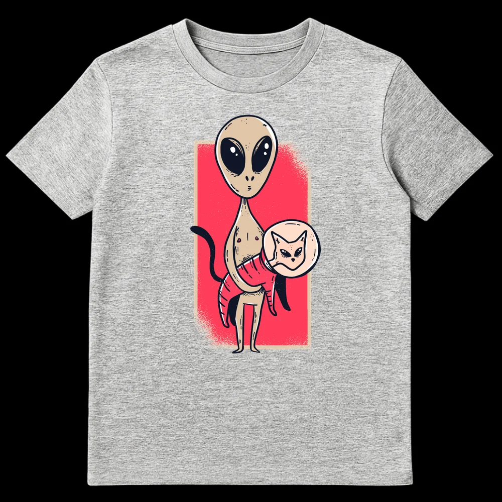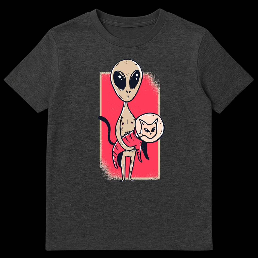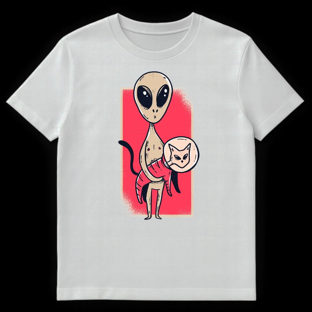 Explore the cosmos with a touch of heartwarming humor in our exclusive “Alien Holding Astronaut Cat” t-shirt. This captivating design showcases a tall, slender grey alien tenderly holding a charming anthropomorphic cat, complete with its own detailed astronaut suit and helmet. It’s a delightful twist on classic alien tropes, portraying our extraterrestrial friend as a caring pet owner rather than an abductor. The quirky illustration and vintage-inspired distressed aesthetic make this tee a standout piece, blending science fiction, feline affection, and a touch of the absurd. This t-shirt is the perfect gift for cat lovers, sci-fi enthusiasts, UFO lore fans, and anyone with a playful sense of humor who appreciates unique, conversation-starting apparel. Wear your love for out-of-this-world companionship and endearing weirdness. Even aliens love cats, and now you can celebrate that cosmic bond!