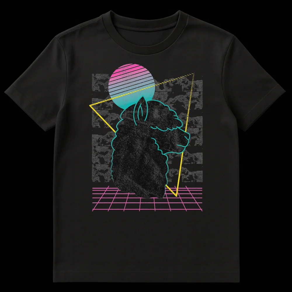 Unleash your inner retro spirit with our eye-catching Synthwave Alpaca t-shirt, a true blend of 80s cool and quirky animal charm. This unique design showcases a mysterious alpaca silhouette, outlined in electric teal neon, set against a stunning backdrop of a hot pink and aqua gradient sunset. The foreground features a vibrant pink neon perspective grid, evoking classic arcade games and VHS-era pop culture. This tee isn’t just clothing; it’s a statement for those who appreciate the ‘ironic cool’ of an ancient animal reimagined in a distinctly digital, synthwave dreamscape. Ideal for retro gaming fans, electronic music enthusiasts, or anyone with a soft spot for alpacas and llamas, it’s a conversation starter and a testament to unique style. Gift it to the friend who loves all things 80s, has an alpaca obsession, or simply enjoys expressing their personality through distinctive apparel. Embrace the nostalgia, the whimsy, and the electric vibe!