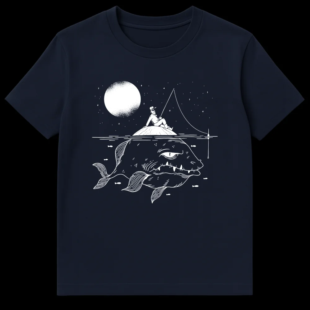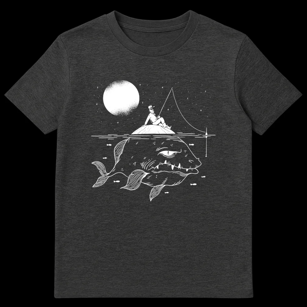 Unravel the suspense with our unique ‘Bigger Fish’ t-shirt, a captivating piece that brings dark humor and a clever visual twist to your wardrobe. This design showcases a lone fisherman blissfully unaware of the colossal, predatory fish lurking just beneath his bait—a true embodiment of dramatic irony. Rendered in a stunning high-contrast black and white line art style, reminiscent of classic etchings, every detail from the textured full moon to the monster’s glowing eye pops with minimalist sophistication. It’s not just a shirt; it’s a conversation starter, perfect for those who enjoy a subtle, intelligent joke. Ideal for anglers who appreciate a self-aware chuckle, fans of mythical creatures, or anyone drawn to thoughtful, slightly eerie artwork. Gift this tee to the person who loves a good visual pun, enjoys the suspense of the unexpected, or simply has a soft spot for unique, illustrative apparel that tells a story.