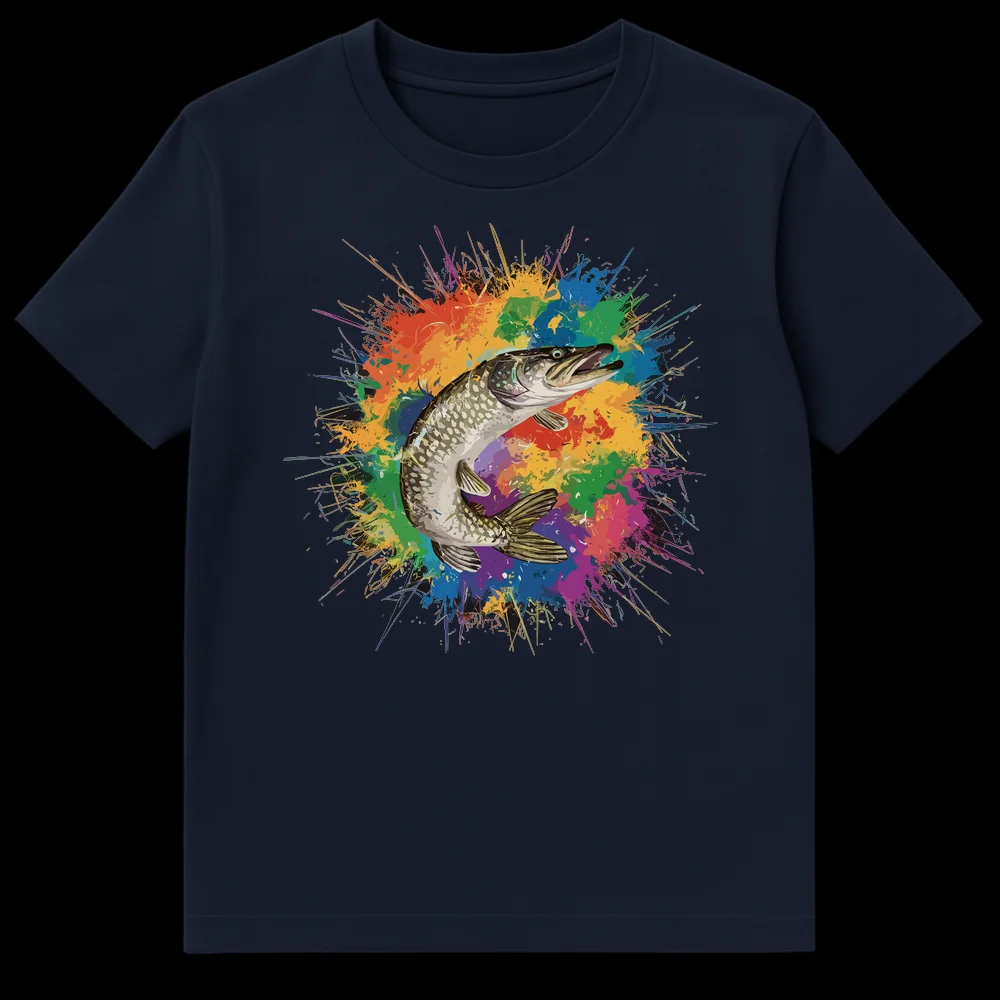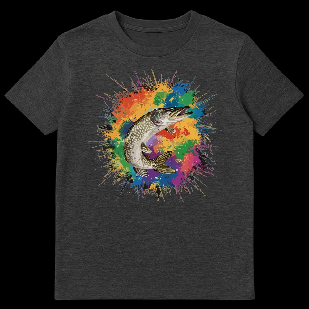 Dive into style with our stunning Northern Pike fishing t-shirt, a true masterpiece for any angling or wildlife enthusiast. This design brilliantly captures a Northern Pike in a powerful, active pose, rendered with intricate detail that highlights its fierce beauty and realistic markings. The fish emerges from an explosive, abstract backdrop of vivid paint splatters in a rainbow of highly saturated colors, creating a sense of dynamic energy and artistic flair. It’s more than just a shirt; it’s wearable art that celebrates the excitement of sport fishing and the majesty of aquatic wildlife. Ideal for the angler who lives for the thrill of the catch, the nature lover who admires powerful predators, or anyone seeking a unique and colorful statement piece. Gift this shirt to celebrate a fishing triumph, a birthday, or just to show appreciation for the great outdoors.