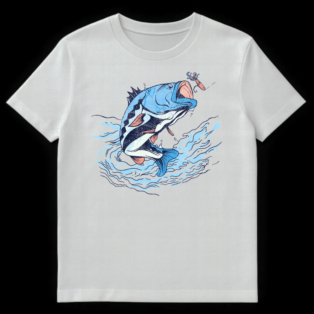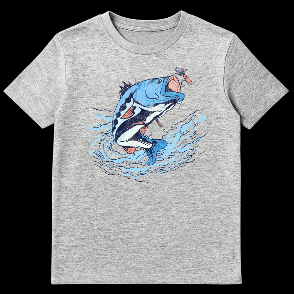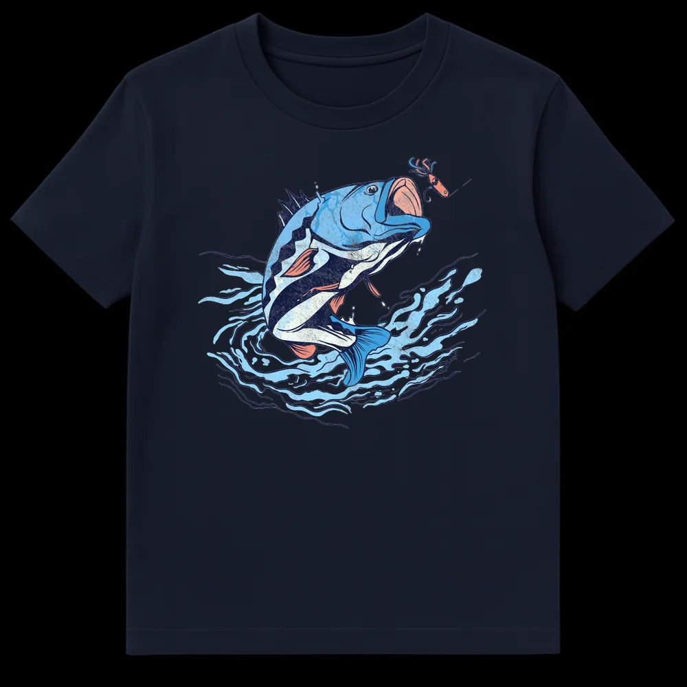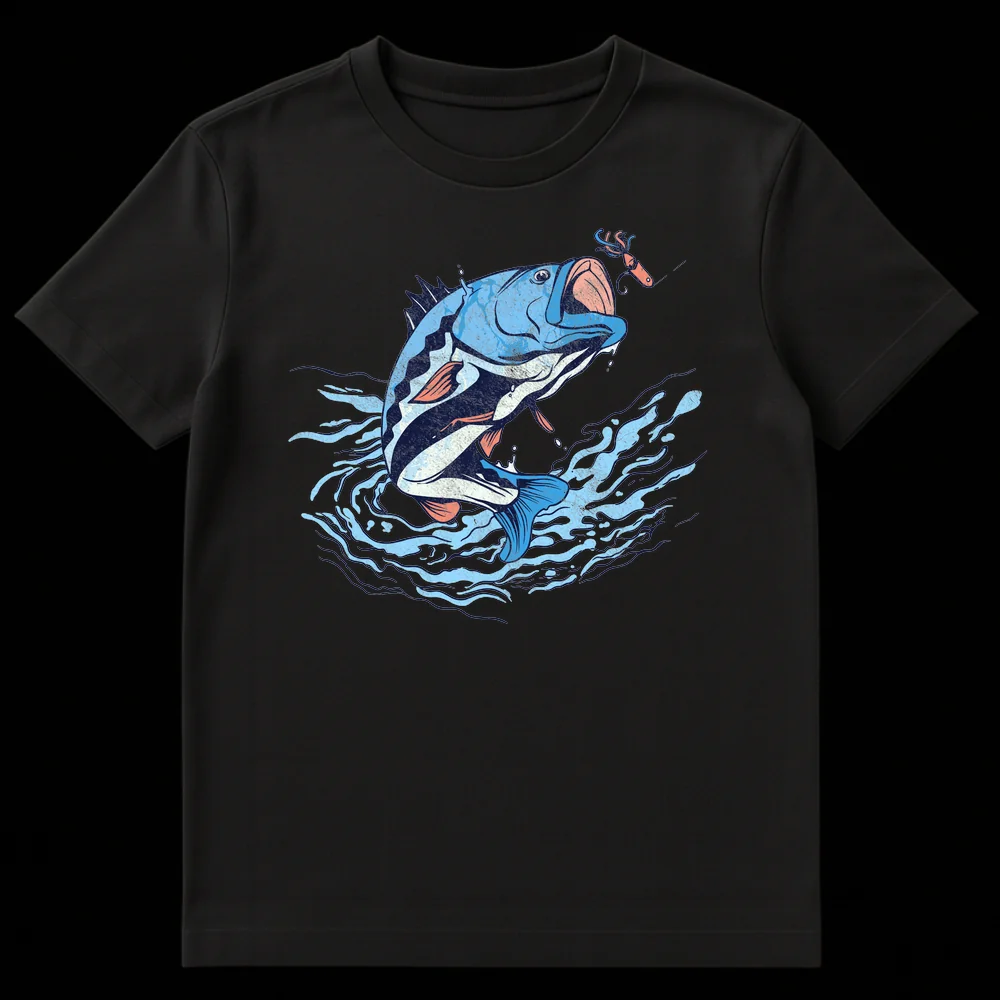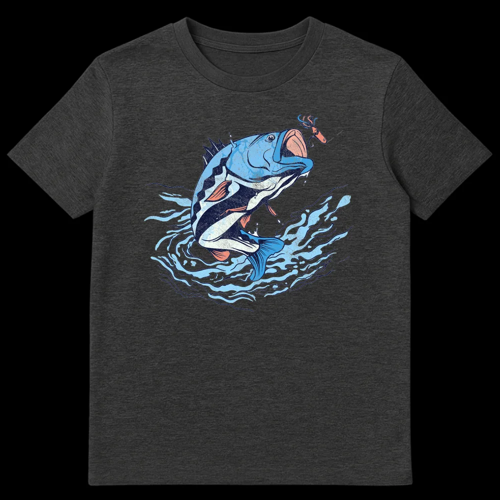 Experience the adrenaline of the catch with this dynamic t-shirt featuring a large game fish aggressively leaping to strike a lure. Its distressed graphic art style delivers a cool, vintage grunge aesthetic perfect for any outdoor enthusiast. Celebrate your passion for the water with this action-packed design. It makes an ideal gift for fishermen, anglers, and anyone who loves the thrill of sport fishing.