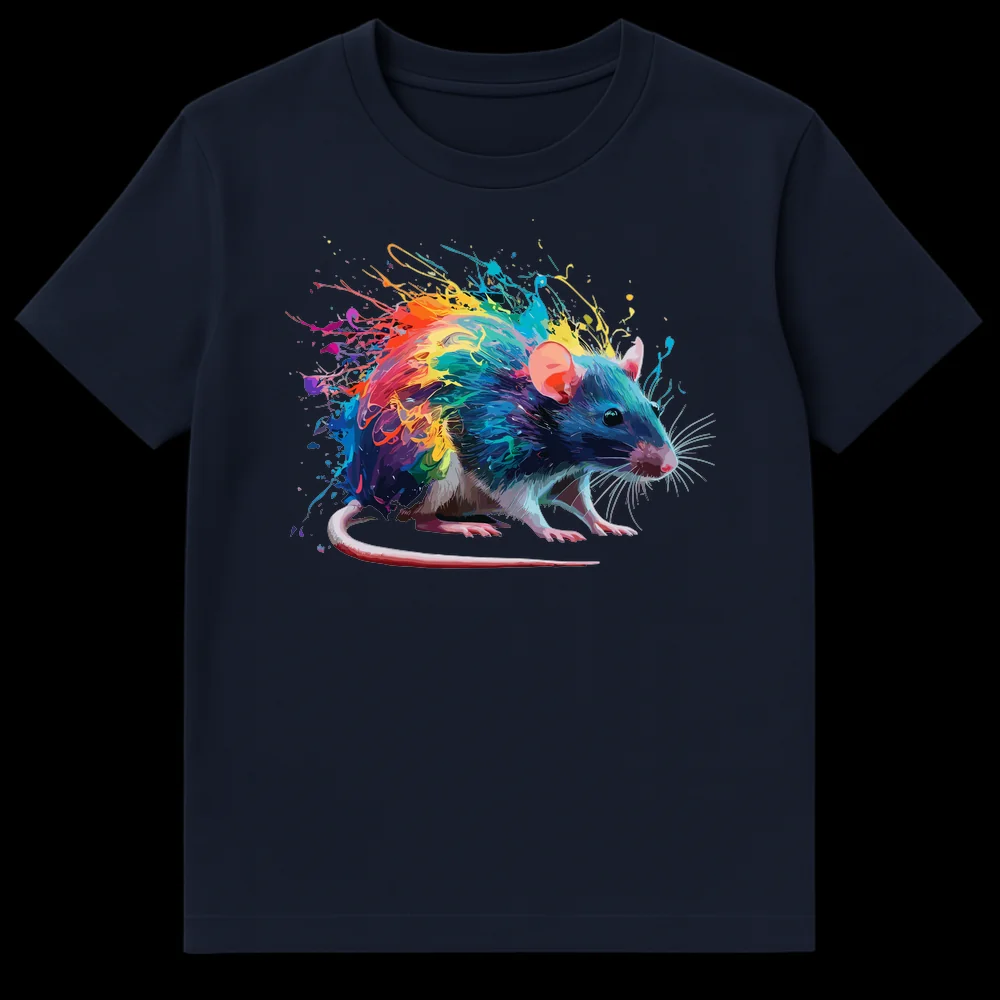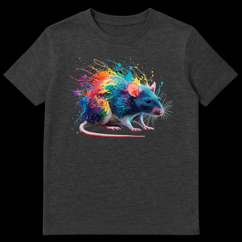 Embrace the extraordinary with our Colorful Paint Splatter Rat T-Shirt, a truly unique piece that transforms the common rat into a captivating work of art. This design beautifully merges a detailed, realistic rat portrait with an explosion of dynamic, rainbow-hued paint splatters and energetic brushstrokes, all set against a dramatic black backdrop. It’s a celebration of color and creativity, designed to challenge perceptions and highlight the hidden beauty in unexpected subjects. Perfect for rat enthusiasts, animal lovers, or anyone who appreciates modern, abstract art and wants to express their vibrant personality. Make a statement and wear your love for unique animal art.