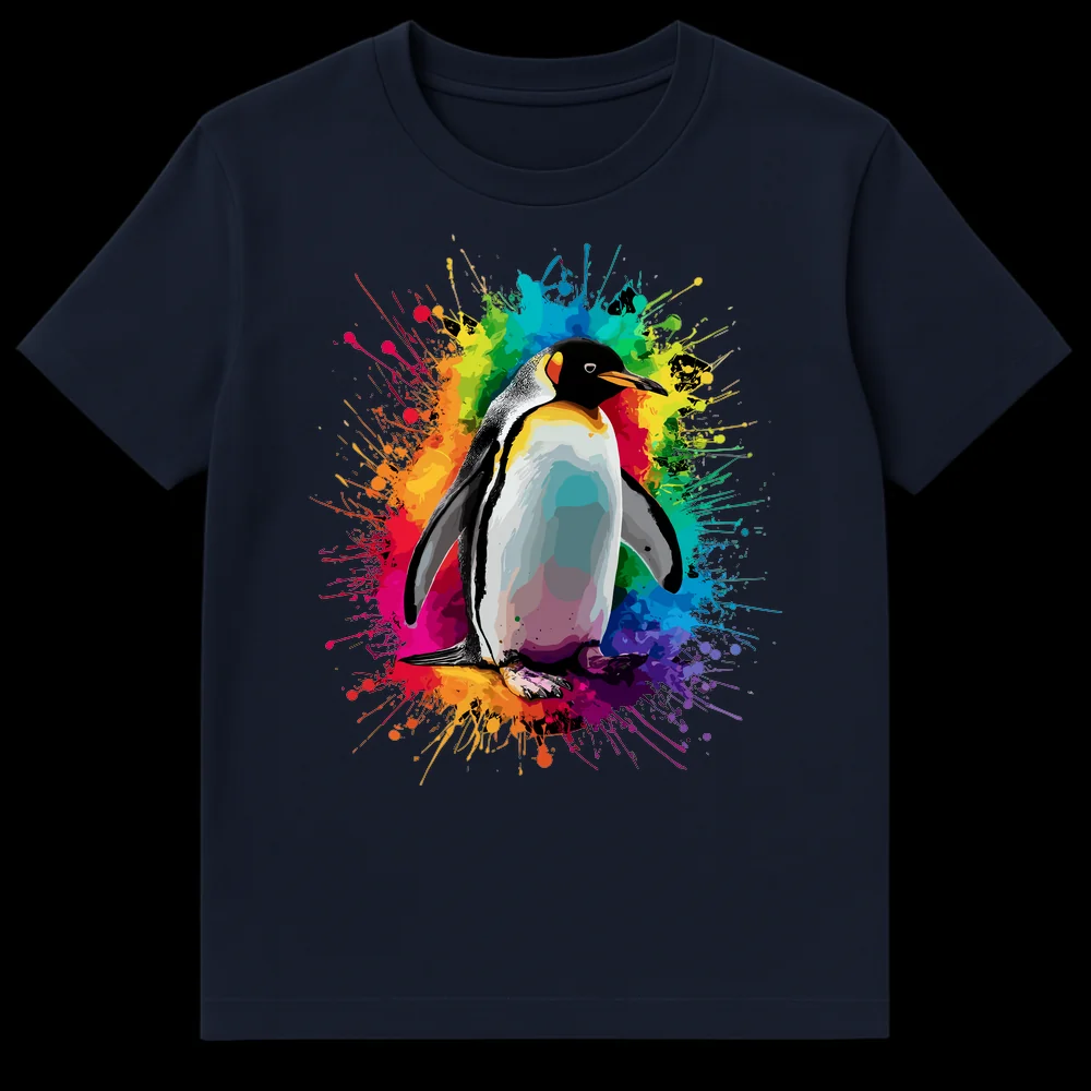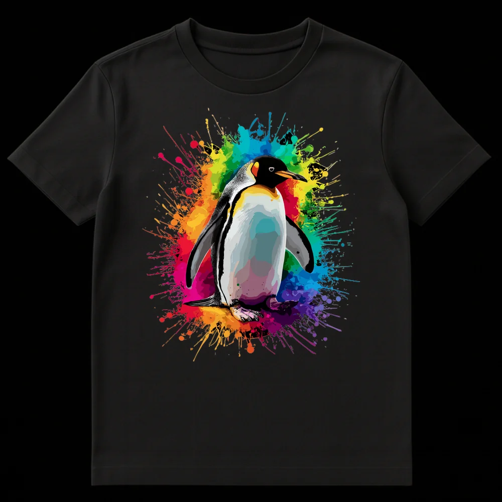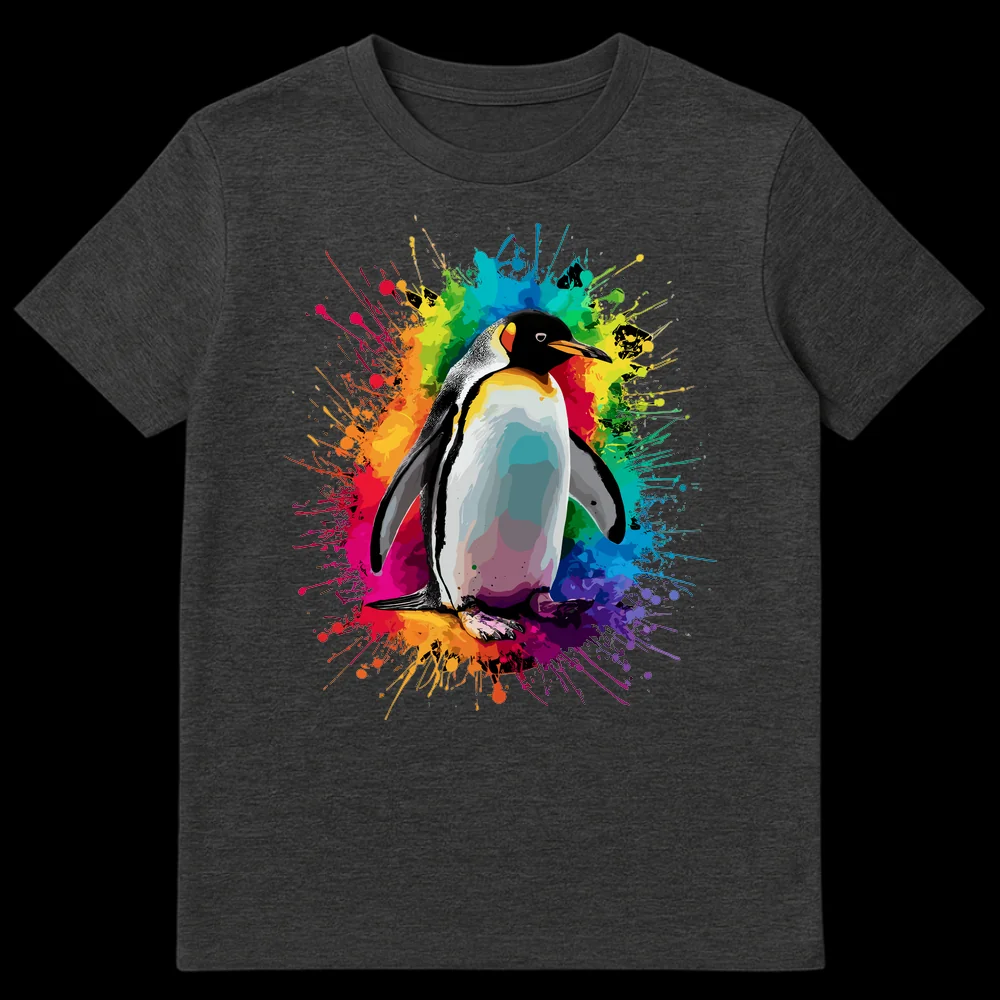 Embrace vibrant style with this unique King Penguin t-shirt featuring a stunning rainbow paint splatter backdrop. This design celebrates the majestic beauty of wildlife intertwined with an explosion of dynamic color, making it truly special. It’s the perfect gift for animal lovers, art enthusiasts, or anyone who adores expressive, eye-catching apparel.