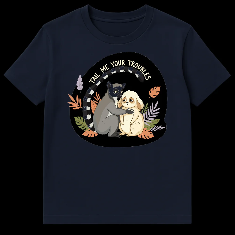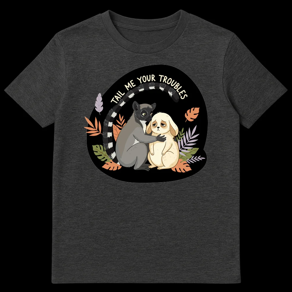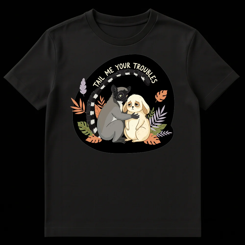 Our ‘TAIL ME YOUR TROUBLES’ tee offers heartwarming comfort with a clever animal pun. Featuring a caring lemur comforting a sad bunny, this design is a gentle reminder to open up. It’s a sweet, empathetic design perfect for animal lovers or anyone who appreciates a touch of lighthearted support. An ideal gift for friends, family, or anyone needing a smile and a listening ear.