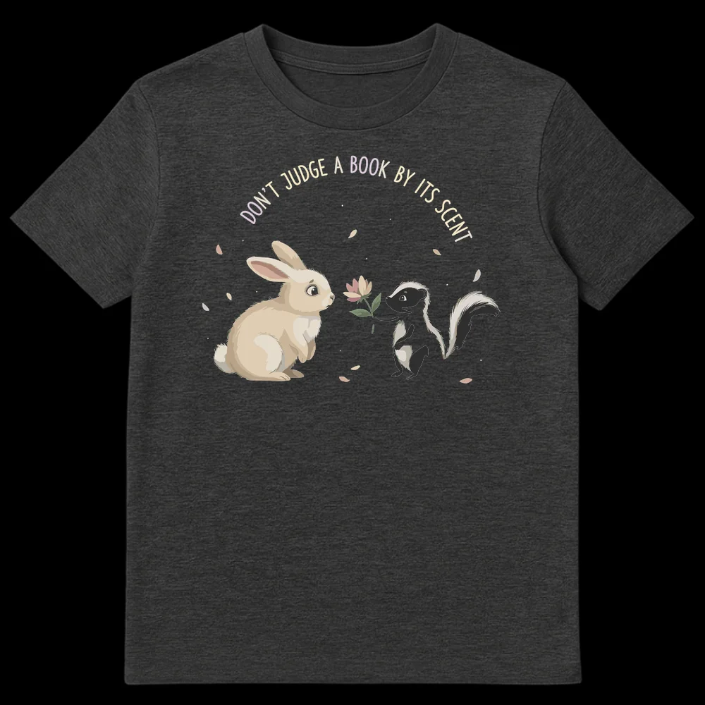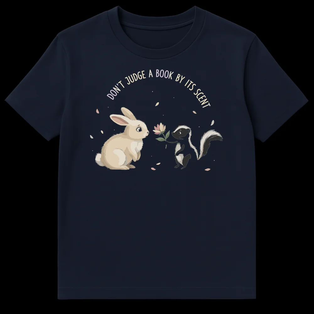 Embrace wholesome humor with our ‘Don’t Judge A Book By Its Scent’ t-shirt. This clever design features a whimsical skunk offering a flower to a cautious rabbit, playfully twisting a classic idiom to promote kindness and acceptance. It’s a sweet, amusing graphic tee perfect for animal lovers or anyone who appreciates a gentle, thought-provoking pun. A wonderful gift for friends, family, or teachers who love unique animal art.