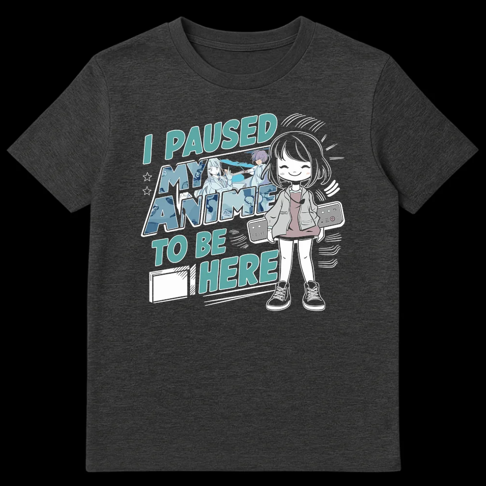 Embrace your inner otaku with this hilarious and relatable “I PAUSED MY ANIME TO BE HERE” graphic tee! Our design features a charming chibi anime girl holding a handheld device, alongside dynamic anime scenes embedded directly into the text, all set against a bold black background. This shirt isn’t just clothing; it’s a badge of honor for dedicated fans, signifying the profound commitment required to pull yourself away from an epic binge-watching session. Perfect for conventions, casual wear, or just showing off your love for Japanese animation. It’s the ultimate conversation starter and a fantastic gift for any anime enthusiast, gamer, or someone who appreciates self-aware humor and cult classic references.