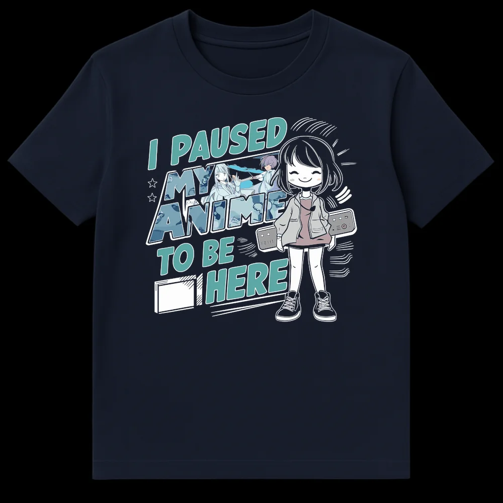 Celebrate your passion with our “I PAUSED MY ANIME TO BE HERE” t-shirt. Featuring a cute chibi character and vibrant anime scenes, this design perfectly captures the relatable struggle of stepping away from your favorite series. It’s a humorous and expressive statement that instantly connects you with fellow anime fans. This tee makes an ideal gift for anyone who lives and breathes Japanese animation.
