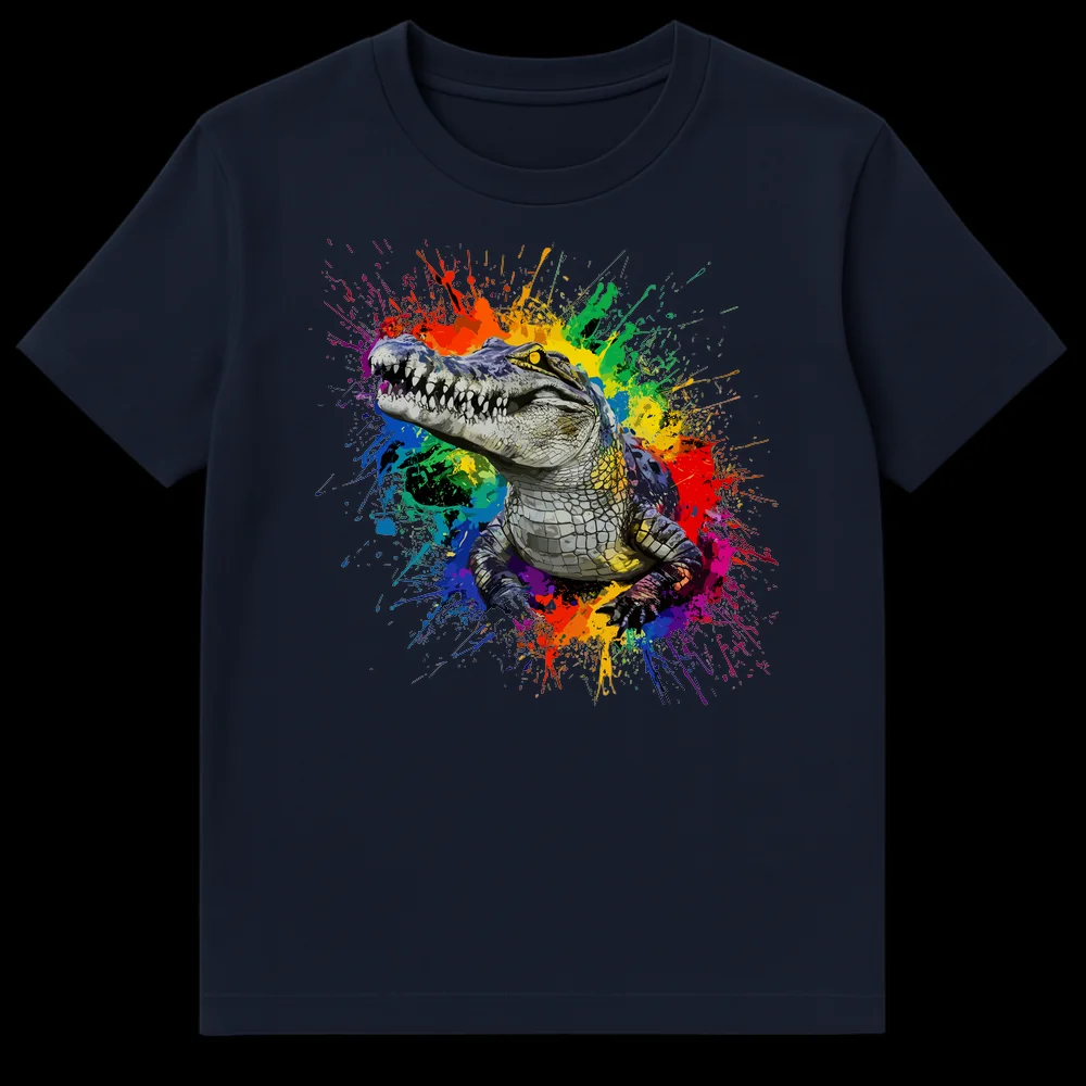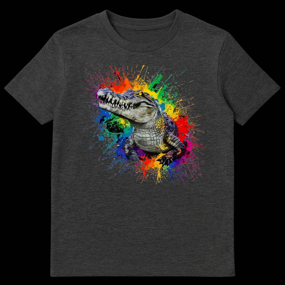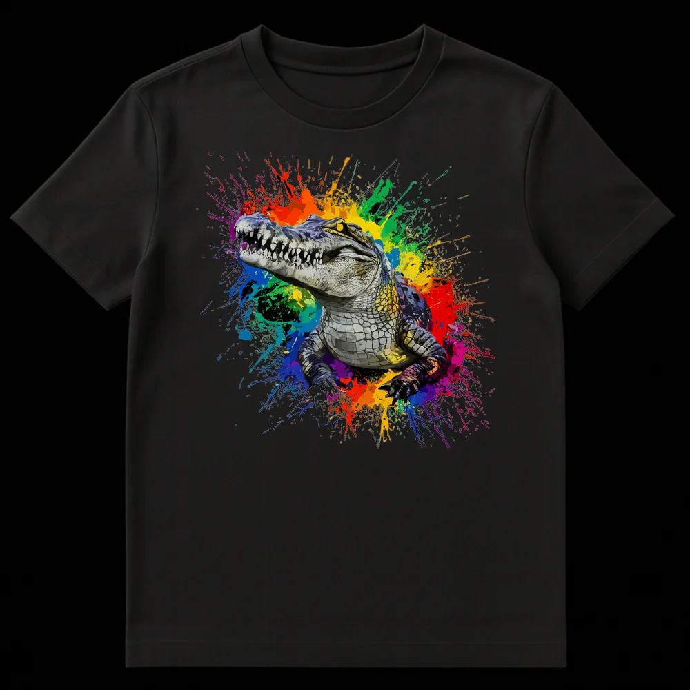 Unleash your wild side with this vibrant alligator design, a fierce reptile emerging from a explosion of rainbow paint splatters. This striking artwork merges primal power with expressive, colorful chaos. Perfect for art lovers or anyone who appreciates a bold, unique statement piece.