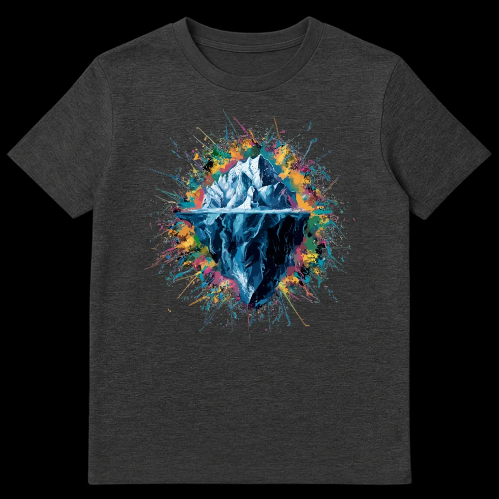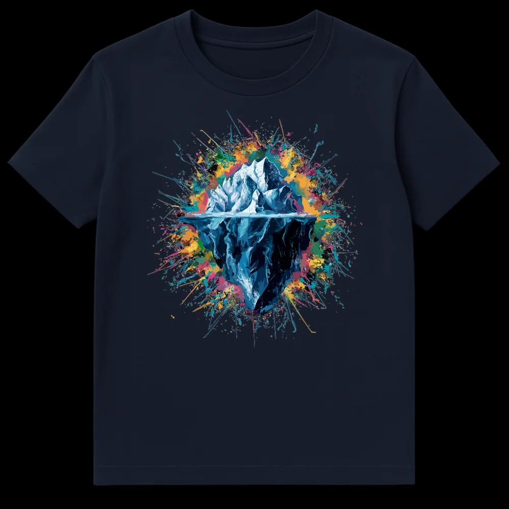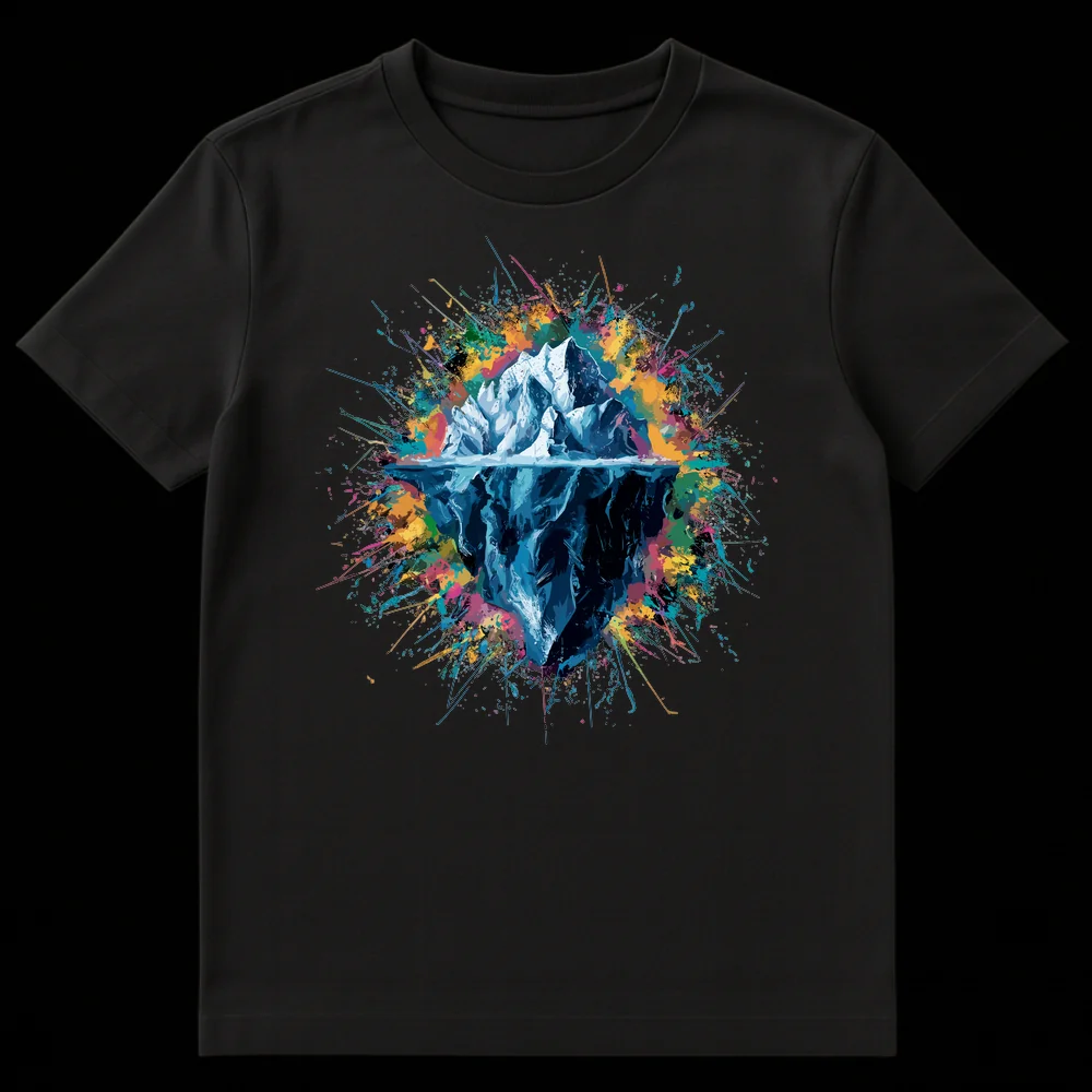 Uncover the unseen with our Iceberg Metaphor T-Shirt. This striking design features a detailed iceberg, its hidden depths revealed, surrounded by an explosive burst of vibrant, abstract colors. It’s a powerful visual metaphor for the complexities beneath the surface, perfect for art lovers, nature enthusiasts, and those who appreciate profound statements.