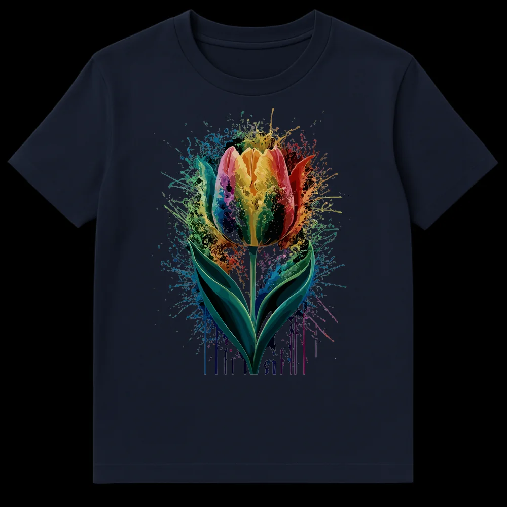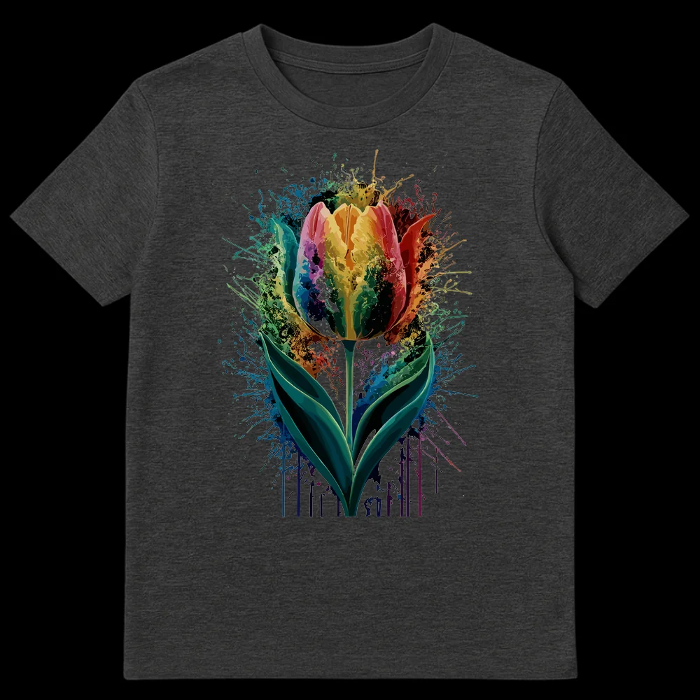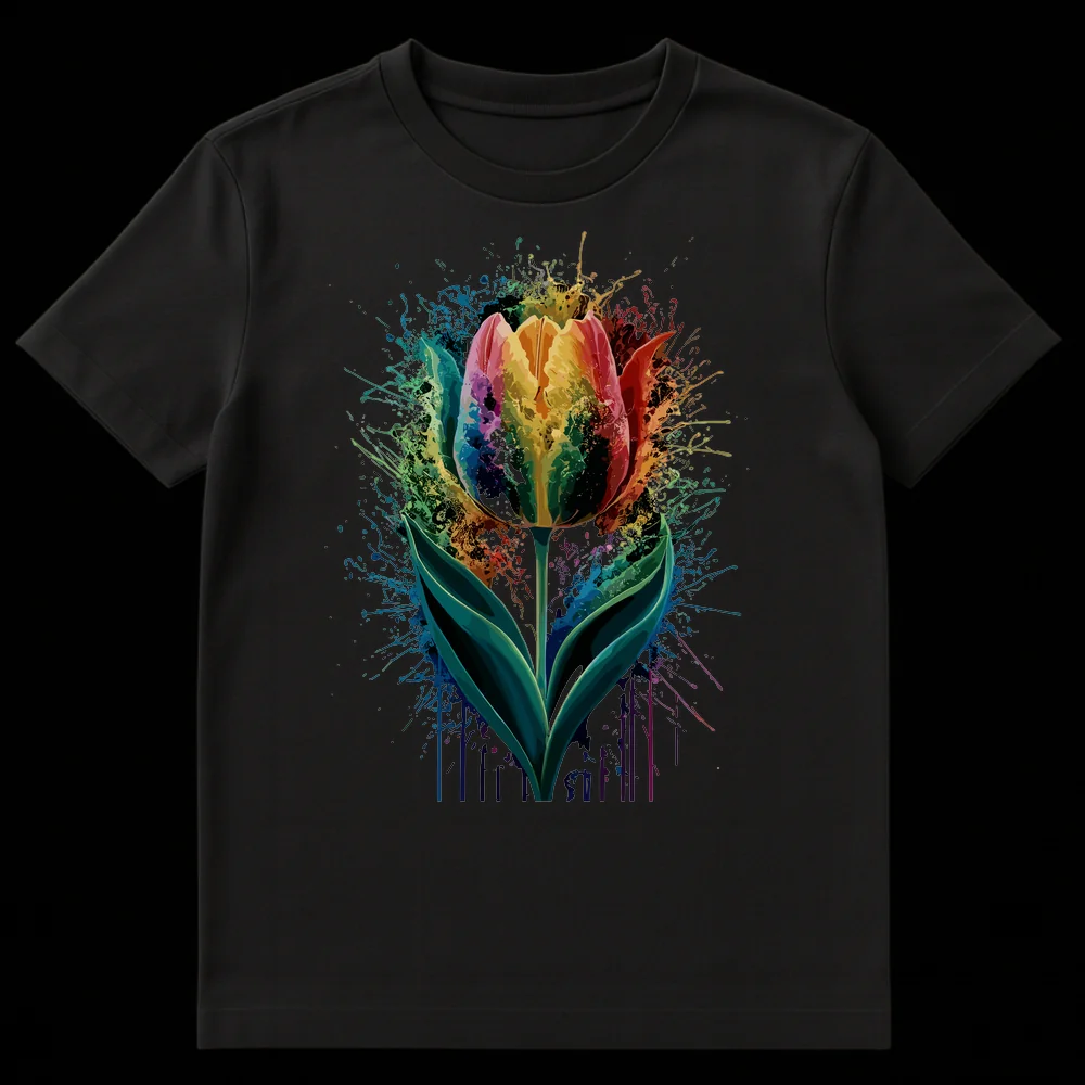 Unleash a burst of color with our vibrant Rainbow Splatter Tulip T-Shirt. This design masterfully blends a classic tulip’s elegance with an explosion of full-spectrum paint, creating a dynamic, artistic statement. It’s the perfect gift for art lovers, gardeners, or anyone who adores expressive, colorful apparel and wants to spread joy.