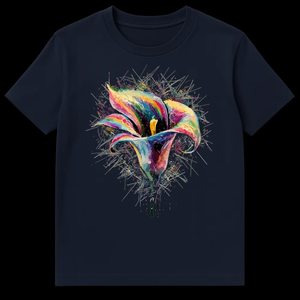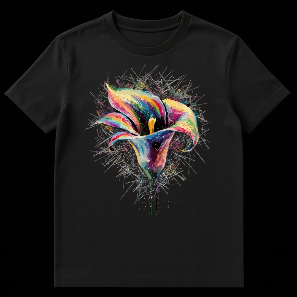 Unleash your artistic spirit with our exclusive Vibrant Calla Lily Abstract T-Shirt. This captivating design transforms the elegant calla lily into an explosion of color and dynamic energy, reminiscent of digital watercolor splash art. Each fractured element radiates outward, showcasing a rich palette of blues, magentas, yellows, greens, and oranges that truly pop against the solid black canvas. It’s a wearable masterpiece for the modern art enthusiast, celebrating nature’s beauty through an abstract lens. Perfect for those who love bold, expressive apparel, this t-shirt is designed to spark joy and admiration. It makes an exceptional gift for art teachers, florists, gardeners, or anyone who cherishes flowers and vibrant, contemporary artistic expressions.