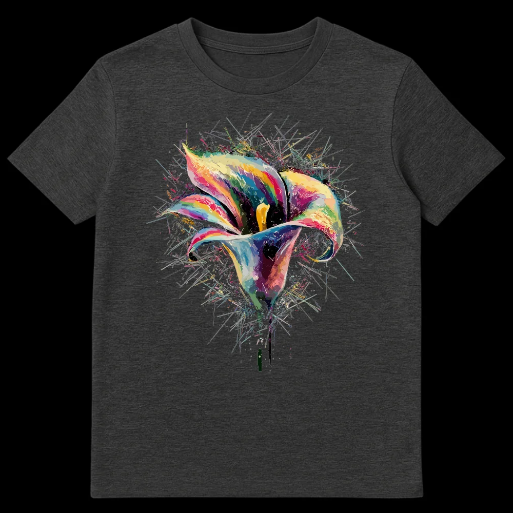 Embrace vibrant energy with our Calla Lily Abstract Art T-Shirt. This design features a stunning, fragmented calla lily bursting with a kaleidoscope of colors against a deep black background, capturing the essence of abstract expressionism. It’s a unique statement piece for anyone who appreciates modern art and nature’s beauty, making it an ideal gift for art lovers, florists, or creative individuals.