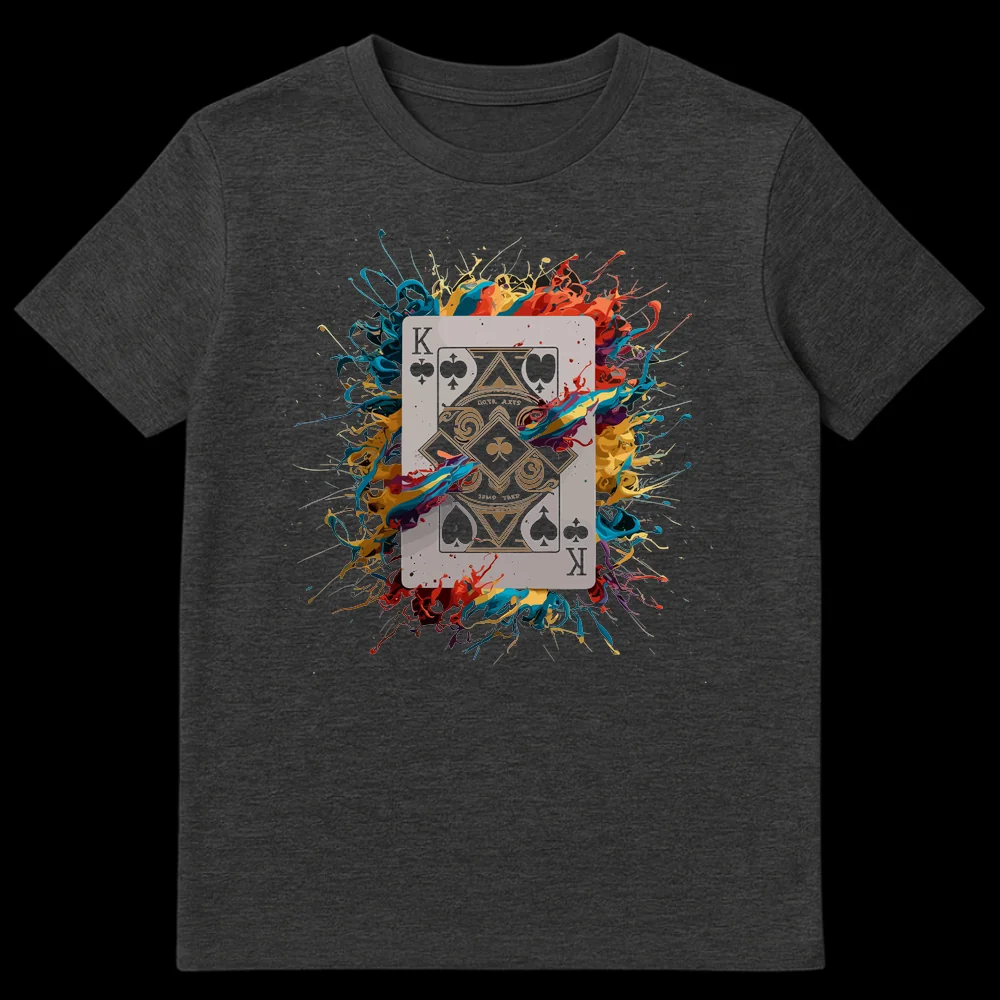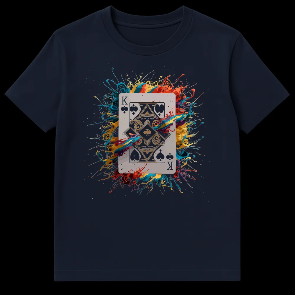 Step into a world where classic games meet contemporary art with our ‘Vibrant King Card’ tee. This isn’t just a shirt; it’s a wearable masterpiece for the modern art enthusiast and card player. The iconic King of Spades is dramatically transformed, bursting from a captivating explosion of electric teal, fiery orange, sunny yellow, and deep royal blue paint splatters. The subtle ‘RO.TR ARTS’ text within the card reinforces the design’s artistic roots, suggesting a royal appreciation for creative expression. This design expertly fuses structured playing card elements with the untamed energy of abstract expressionism and street art, creating a visually compelling narrative of controlled chaos and artistic freedom. It’s an ideal gift for poker players, blackjack aficionados, graphic design fans, or anyone who loves to make a bold, stylish statement with their wardrobe. Wear your passion for games and art with this unique and unforgettable t-shirt.