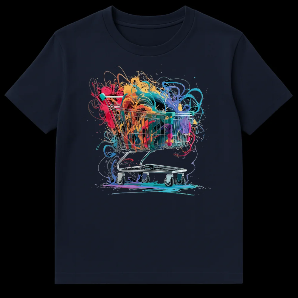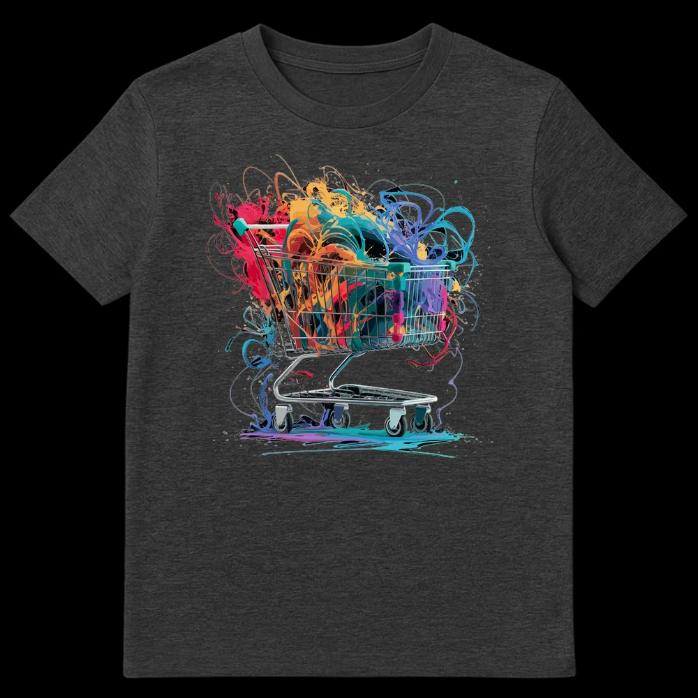 Unleash your creative spirit with this dynamic t-shirt featuring a shopping cart overflowing with a vivid paint explosion. This unique design beautifully juxtaposes the mundane with artistic chaos, perfect for art lovers and those who appreciate expressive, colorful aesthetics. A fantastic gift for anyone passionate about art or bold statement fashion.