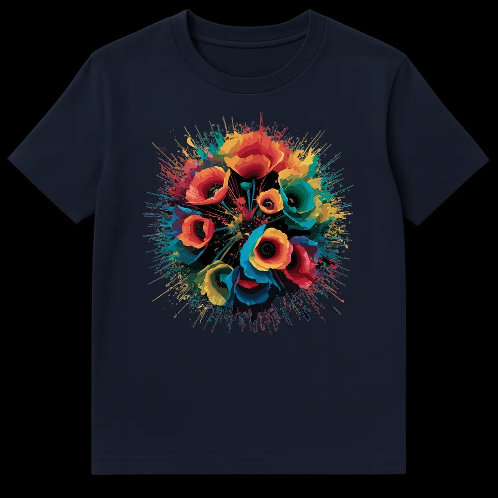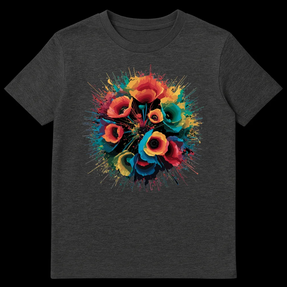 Unleash your artistic spirit with this captivating abstract floral t-shirt. Featuring a dynamic explosion of poppy-like flowers rendered in a vibrant, multi-color paint splatter style, this design is a true wearable masterpiece. Perfect for anyone who loves modern art, bold colors, and making a unique fashion statement, it makes an ideal gift for art lovers, nature enthusiasts, or creative individuals.