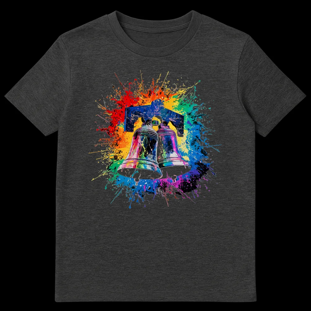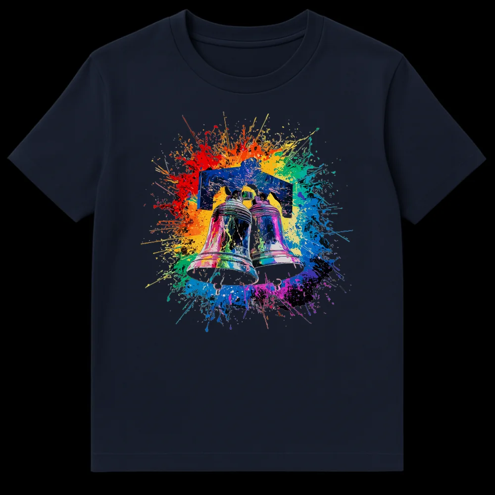 Celebrate individuality with this striking t-shirt featuring two ornate bells bursting with a rainbow of vibrant paint splatters against a bold black background. This expressive design merges pop art and abstract styles, creating a powerful statement piece that’s perfect for art lovers and free spirits. It’s an ideal gift for anyone who appreciates unique, colorful, and energetic apparel.