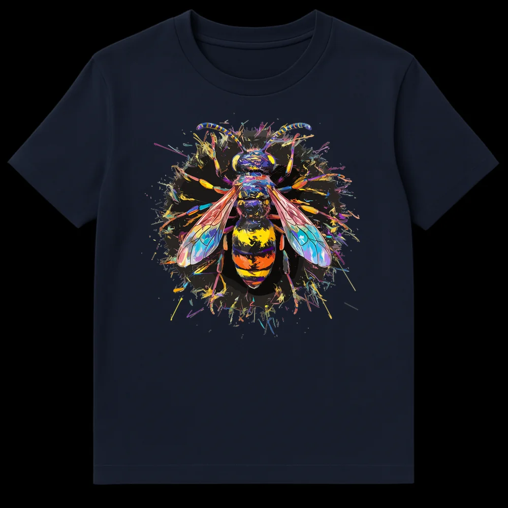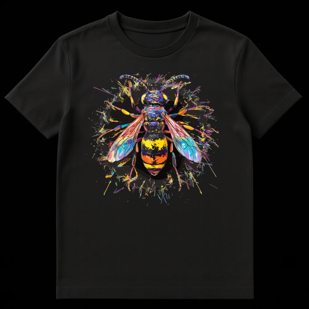 Unleash your artistic side with this stunning t-shirt featuring a highly stylized, abstract bee or wasp, bursting with a dynamic rainbow splatter design. Set against a deep black background, this eye-catching graphic celebrates nature’s beauty through a vibrant, contemporary lens. Perfect for art lovers, nature enthusiasts, or anyone who appreciates bold, unique graphic apparel.