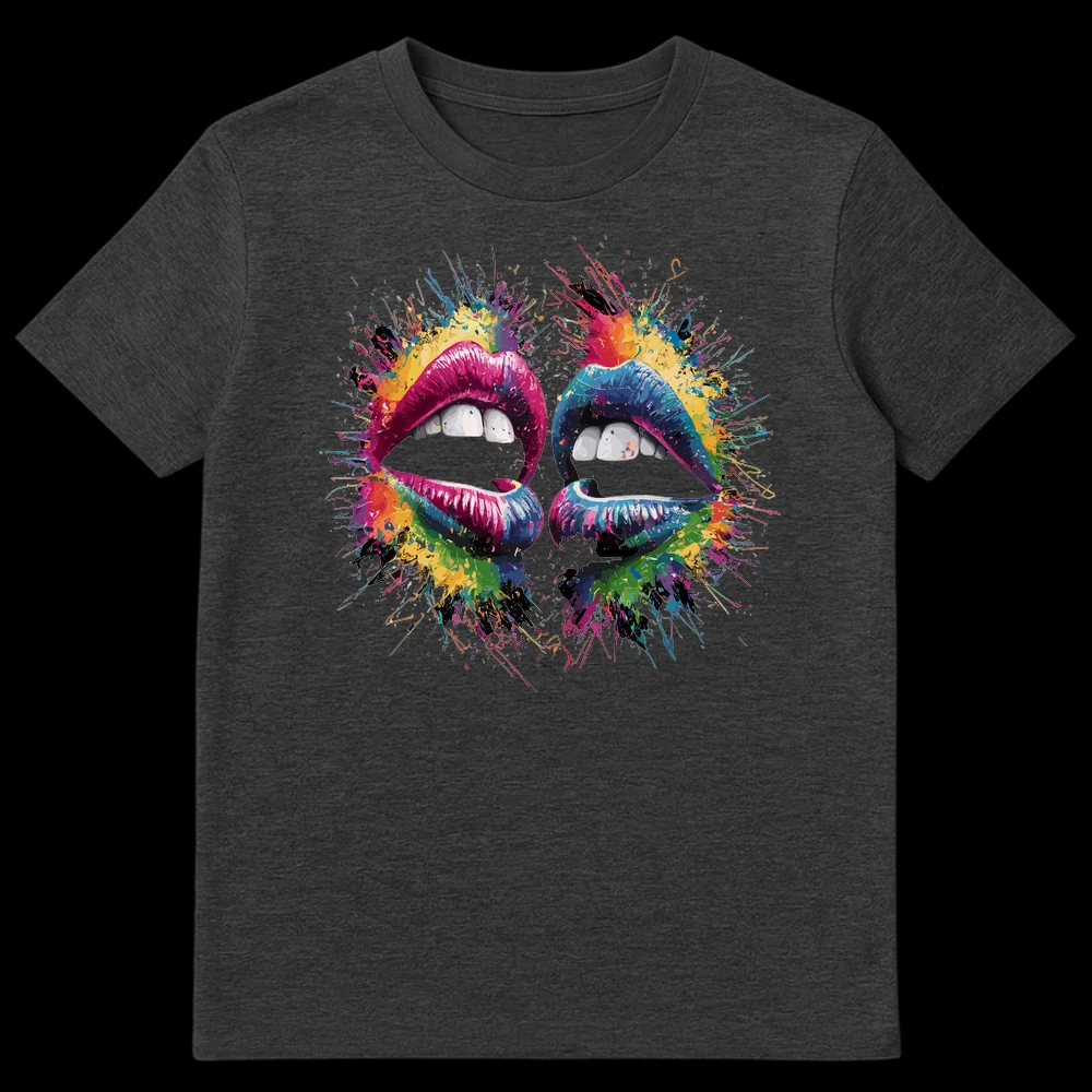 Unleash your passion with this electrifying tee featuring two sets of lips in a vibrant, multi-colored paint splatter design. This unique pop art aesthetic captures an explosion of emotion and artistic freedom, making a bold statement. It’s the perfect gift for art lovers, creative spirits, or anyone who celebrates individuality and expressive fashion.
