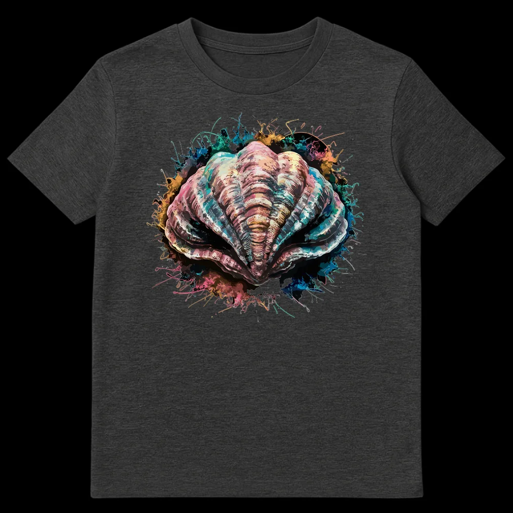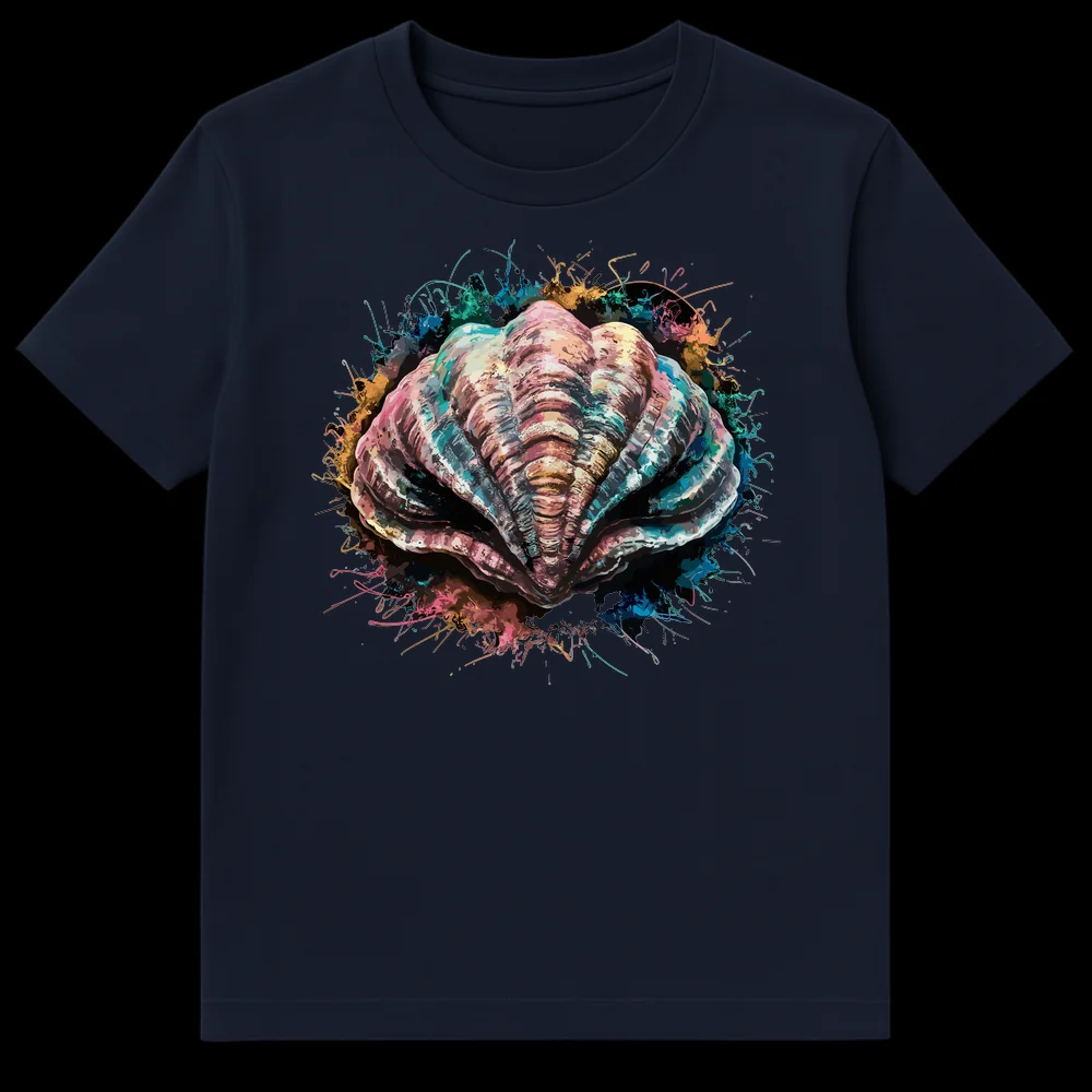 Dive into dynamic artistry with this captivating t-shirt featuring a detailed bivalve shell amidst an explosion of colorful paint splatters. This unique design blends painterly realism with abstract expressionism, creating a visually striking statement piece. It’s the perfect artistic gift for marine life lovers and anyone who appreciates modern, expressive apparel.