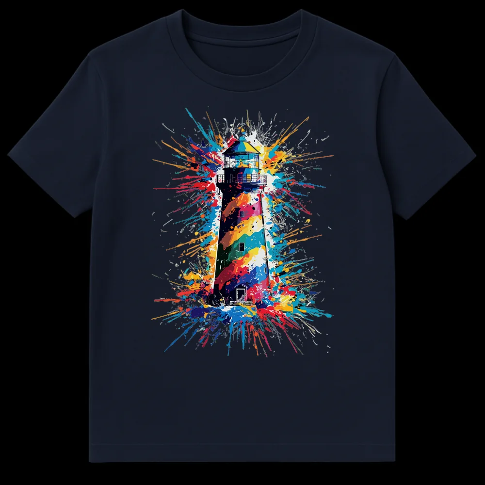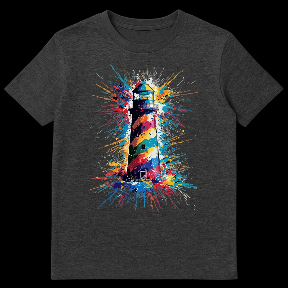 Dive into vibrant style with this unique lighthouse t-shirt, where iconic guidance meets an explosion of abstract expression. Featuring a multi-chromatic paint splatter effect on a stark black background, this design transforms a traditional symbol into a dynamic work of art. It’s the perfect gift for artists, creatives, urban fashion enthusiasts, or anyone who loves bold, expressive apparel.