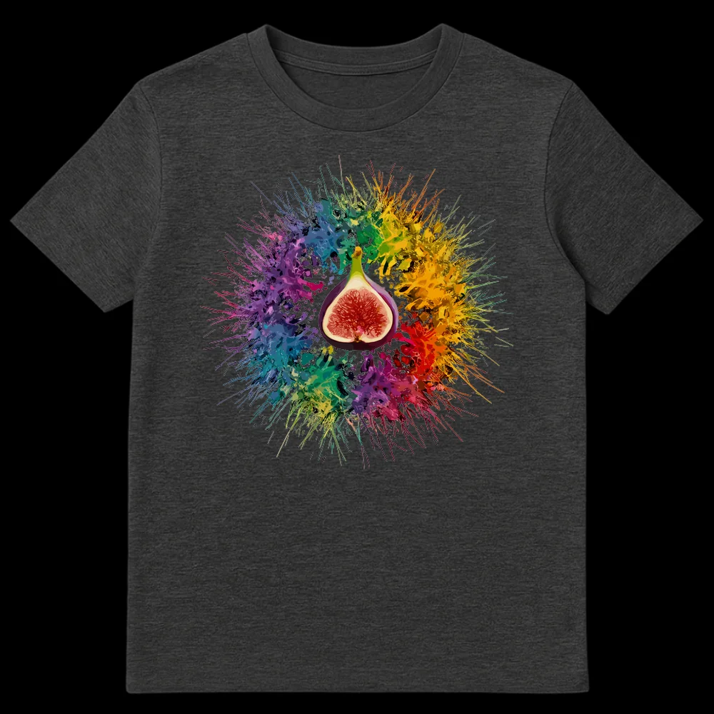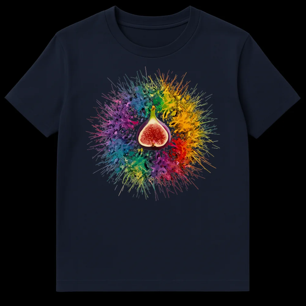 Celebrate nature’s beauty with this unique t-shirt featuring a sliced fig exploding into a vivid rainbow splash against a stark black background. The design blends realistic fruit detail with abstract expressionism, creating an energetic and visually striking aesthetic. Perfect for art enthusiasts, foodies, or anyone seeking a vibrant, statement piece of apparel.