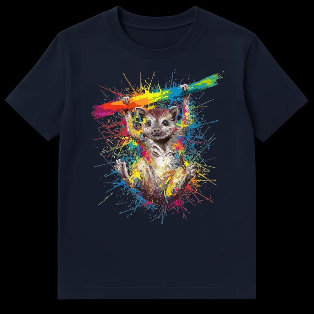 Celebrate creativity with our eye-catching t-shirt featuring a playful tree shrew or opossum. This unique design showcases a cute animal clinging to a rainbow branch amidst an explosion of colorful splatter paint. It’s a perfect blend of nature’s charm and expressive art, ideal for anyone who loves vibrant, unique apparel. A fantastic gift for animal enthusiasts and art lovers alike.