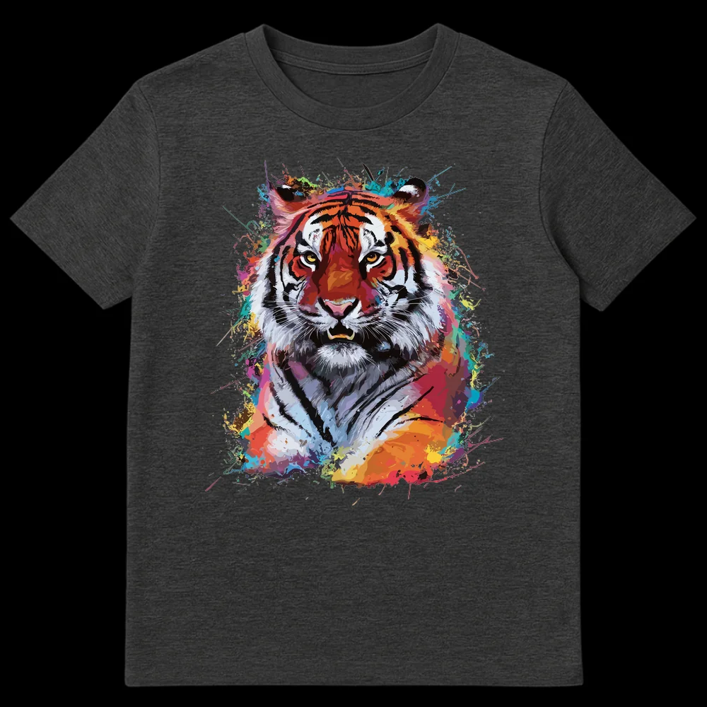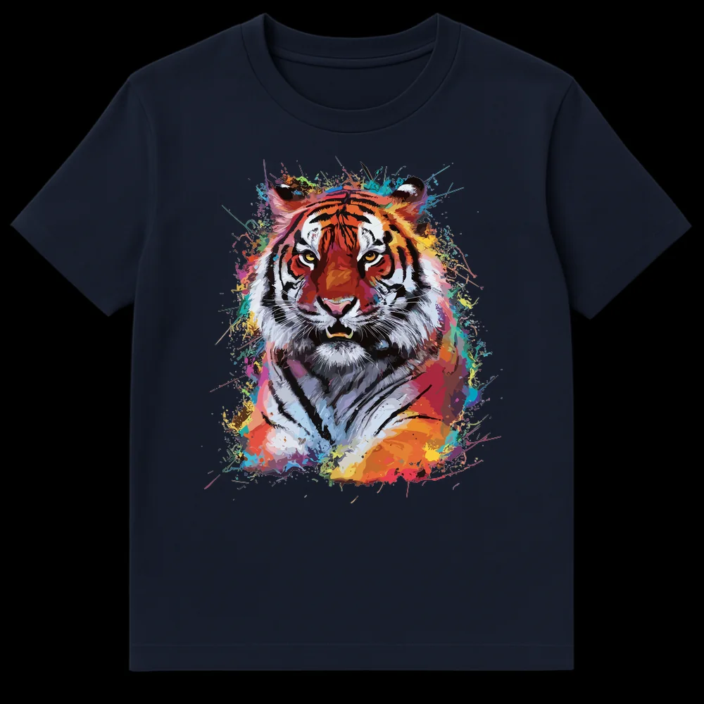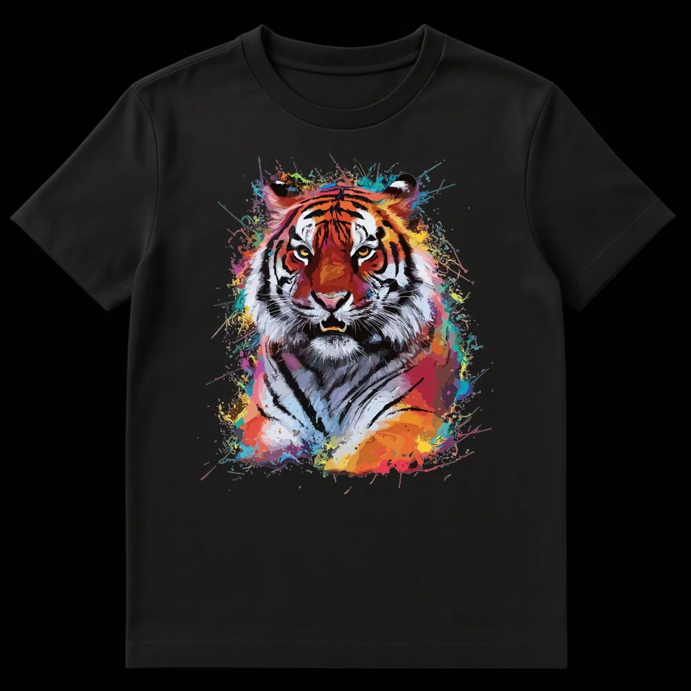 Ignite your wardrobe with the raw energy of our Vibrant Splatter Tiger T-Shirt, a true masterpiece of wearable art. This design showcases a powerful tiger, depicted with a fierce gaze and hints of a growl, brought to life through dynamic paint splatters and watercolor splashes in a kaleidoscope of cool and warm tones. Set against a deep black canvas, the rich oranges, fiery reds, electric blues, and neon greens make the tiger pop, creating an illusion of movement and artistic spontaneity. More than just a shirt, it’s a statement piece that embodies strength, majesty, and a bold embrace of individuality. There’s no humor, just pure, untamed artistic expression. Perfect for anyone who connects with the tiger’s symbolism of power and beauty, or those who simply adore contemporary art and unique graphic designs. Surprise a wildlife enthusiast, an art lover, or someone with a confident, expressive style with this unforgettable tee.
