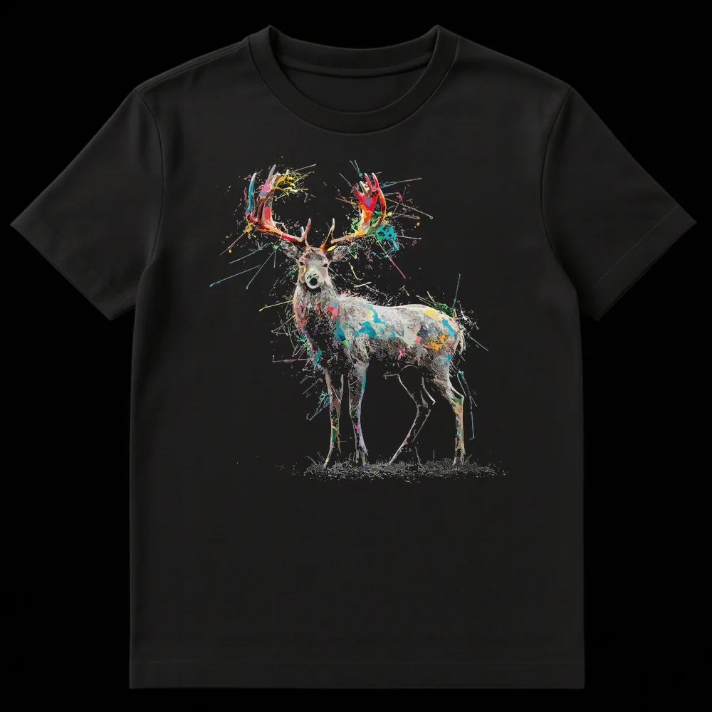 Embrace wild artistry with our unique Splash Art Deer T-Shirt. This design brilliantly merges the noble presence of a stag with an explosion of vibrant, abstract paint splatters against a striking black backdrop. It’s an energetic, modern statement piece perfect for art enthusiasts, nature lovers, or anyone seeking distinctive, creative apparel. A fantastic gift for artists or those who appreciate unconventional wildlife interpretations.