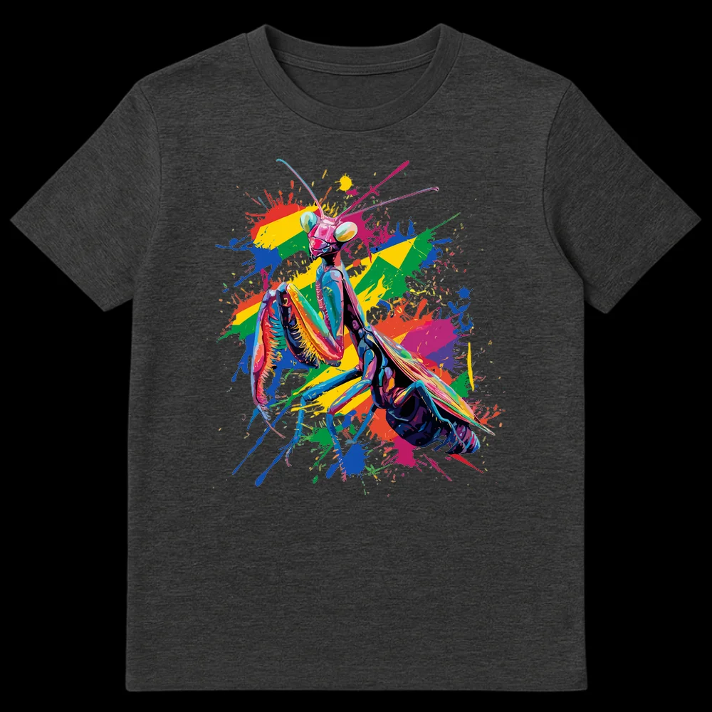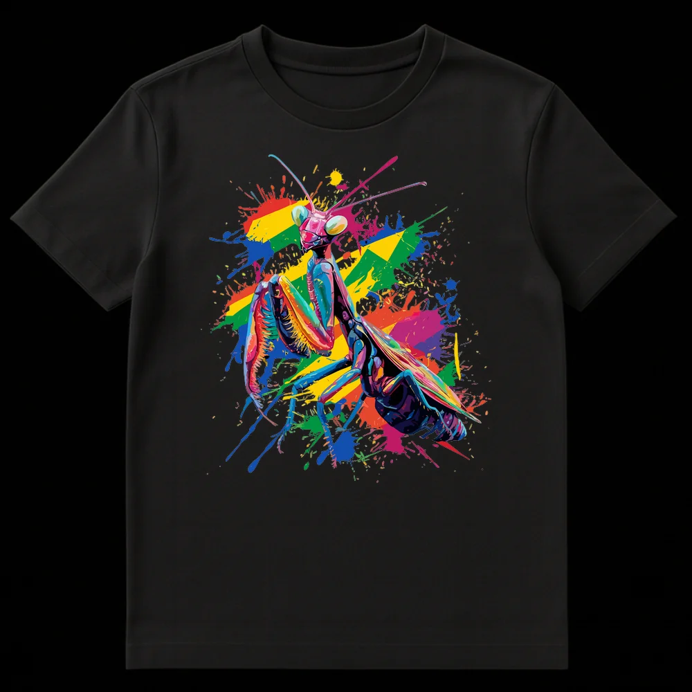 Unleash your artistic spirit with this captivating Pop Art Praying Mantis T-shirt. Featuring a stylized, multi-colored mantis against an explosion of psychedelic paint splatters on a black canvas, this design is a true visual statement. It’s perfect for art enthusiasts, insect lovers, or anyone who appreciates bold, expressive apparel that stands out.