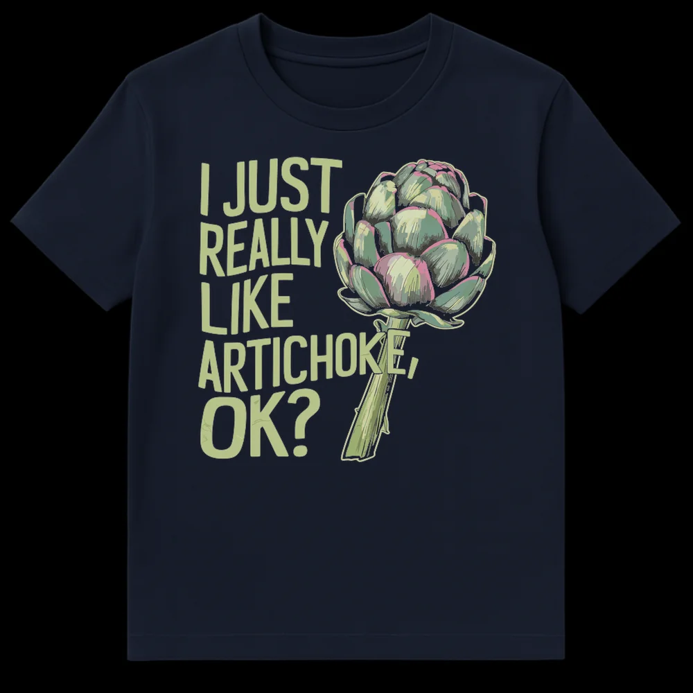 Unleash your inner artichoke aficionado with this distinctive t-shirt, a must-have for anyone who truly ‘gets’ the artichoke allure. The design proudly proclaims “I JUST REALLY LIKE ARTICHOKE, OK?” – a playful, slightly defensive statement that resonates with anyone who’s had to justify their favorite niche food. Accompanying this witty text is a beautifully rendered artichoke illustration, brought to life with a blend of earthy greens and a surprising pop of muted magenta. This shirt is more than just apparel; it’s a conversation starter and a testament to one’s unique culinary passions. Ideal for food enthusiasts, vegetarians, vegans, chefs, or gardeners, it makes a fantastic novelty gift or a charming everyday wear item for those who appreciate understated humor and quirky self-expression. Show the world your artichoke pride!