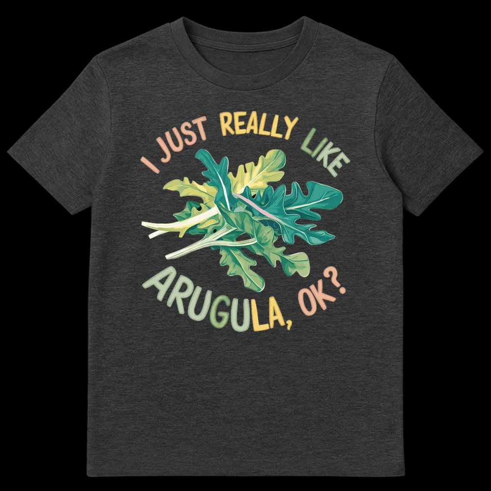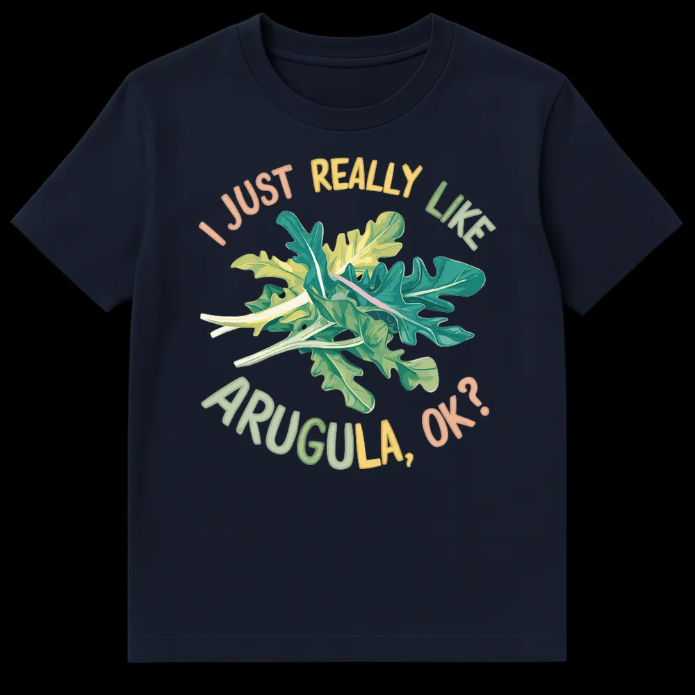 Declare your love for the peppery green with our “I JUST REALLY LIKE ARUGULA, OK?” t-shirt. This design features a vibrant, cartoon-style arugula illustration alongside a playfully assertive slogan, perfect for anyone with strong, delicious opinions. It’s a fun, relatable statement for vegetarians, gardeners, or any passionate foodie.