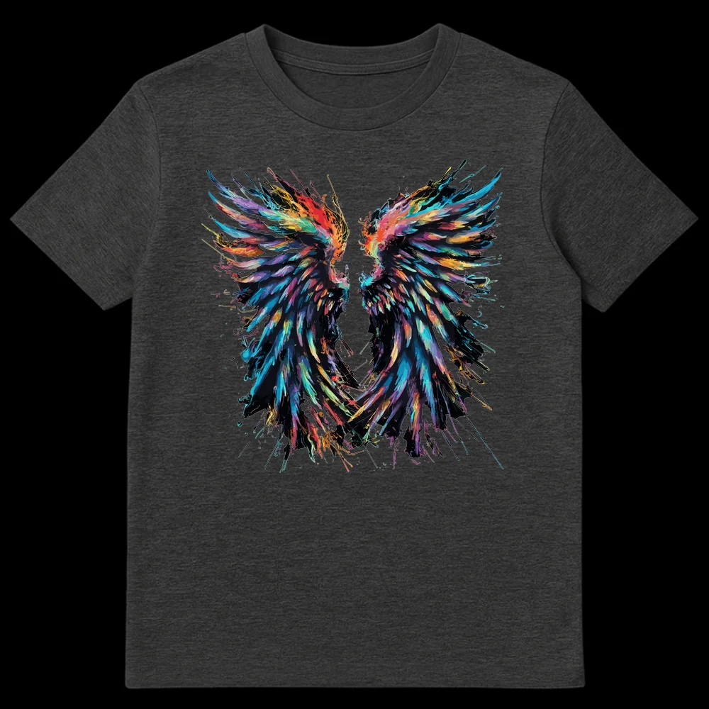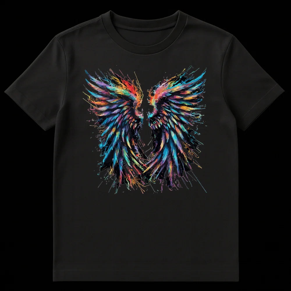 Embrace the spirit of freedom and self-expression with this vibrant Abstract Wings t-shirt. Featuring a stunning splatter art design of stylized angel wings in a kaleidoscope of colors against a deep black background, this tee symbolizes hope, transformation, and individuality. It’s an inspiring choice for anyone who loves unique, artistic apparel or seeks a powerful statement piece.