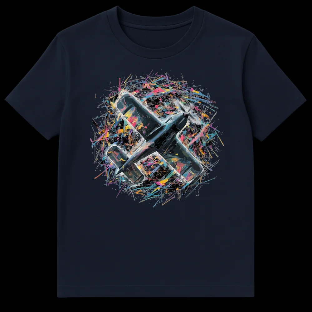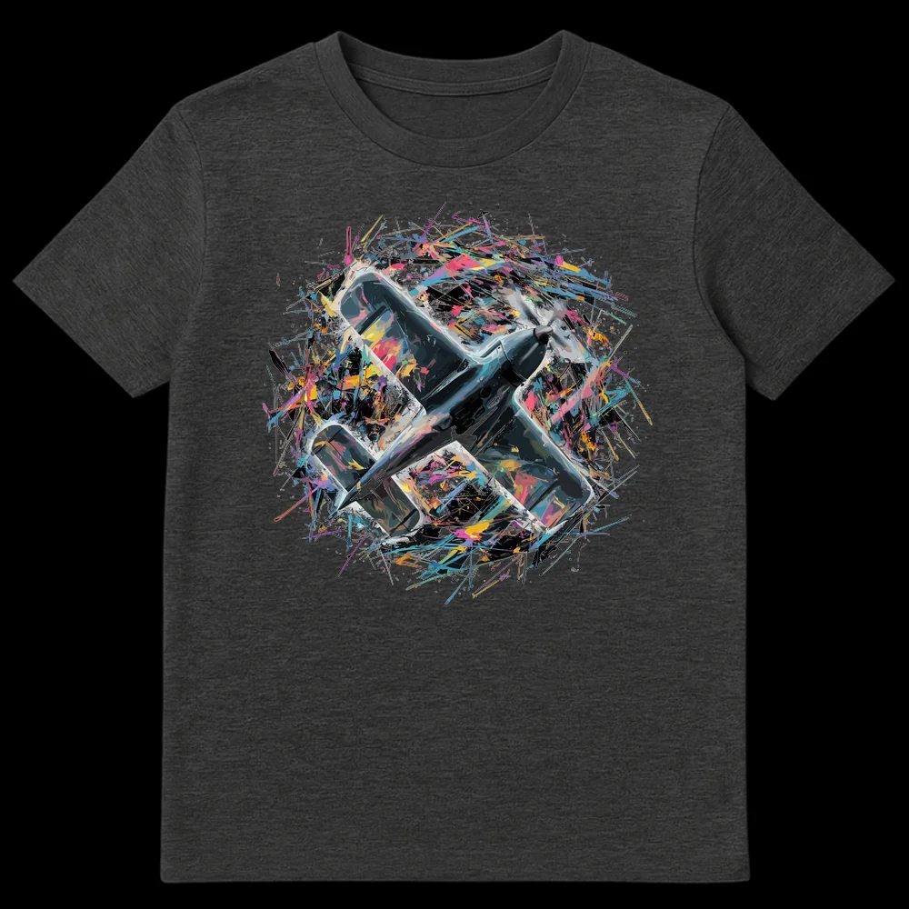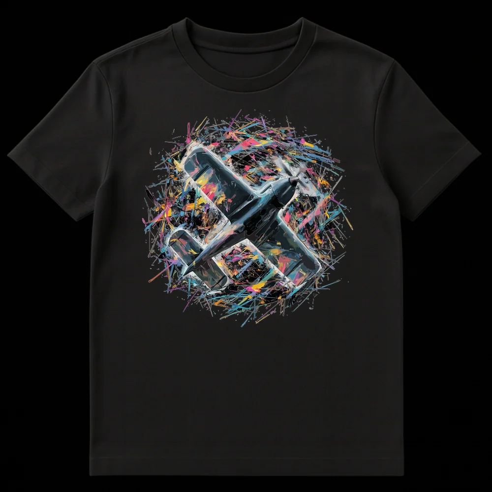 Celebrate the spirit of flight with this visually striking t-shirt, featuring a classic propeller plane dynamically breaking free amidst an explosion of abstract, vibrant colors. This unique design merges detailed illustration with energetic splatter art, symbolizing speed, freedom, and artistic expression. It’s the perfect gift for aviation enthusiasts and art lovers who appreciate bold, expressive apparel.