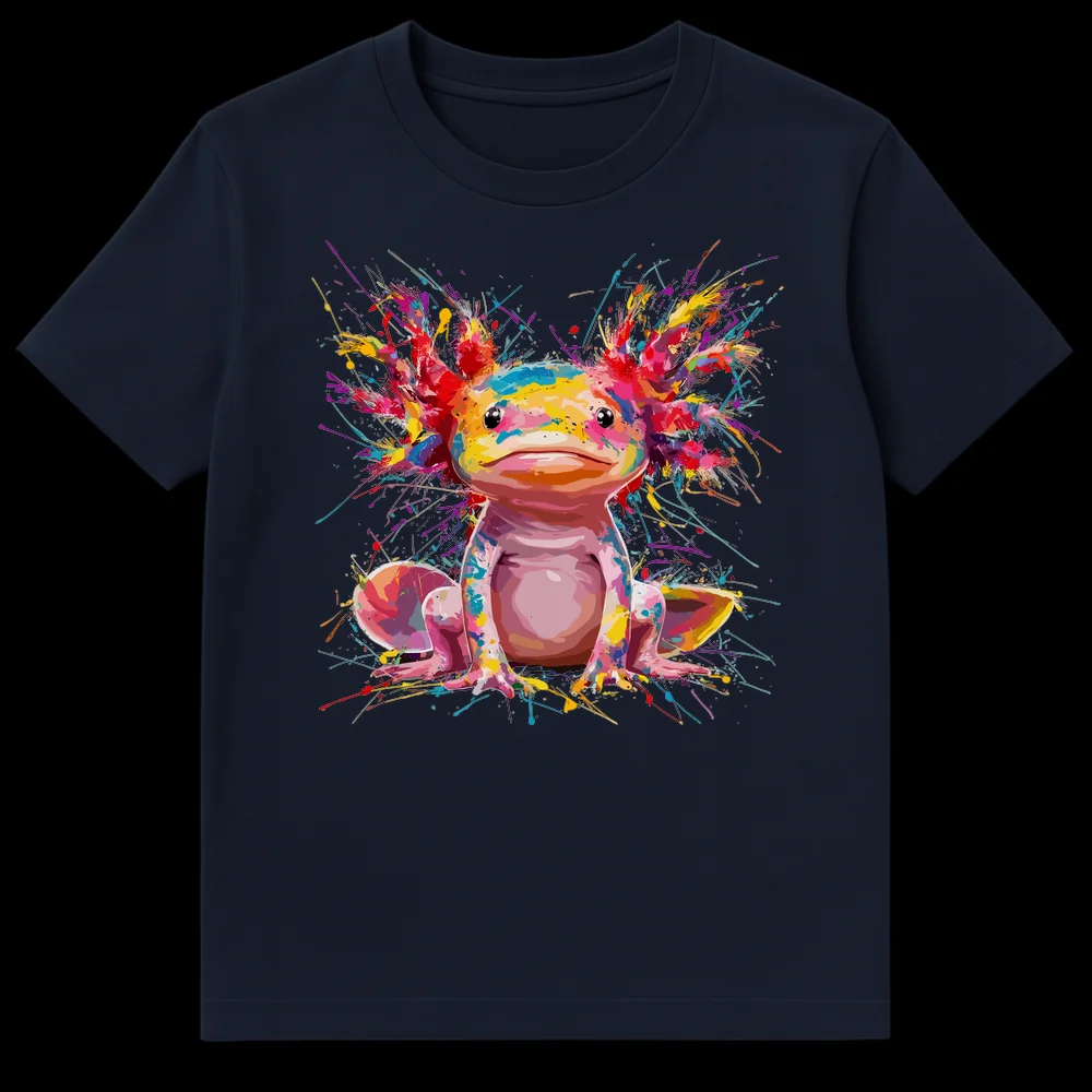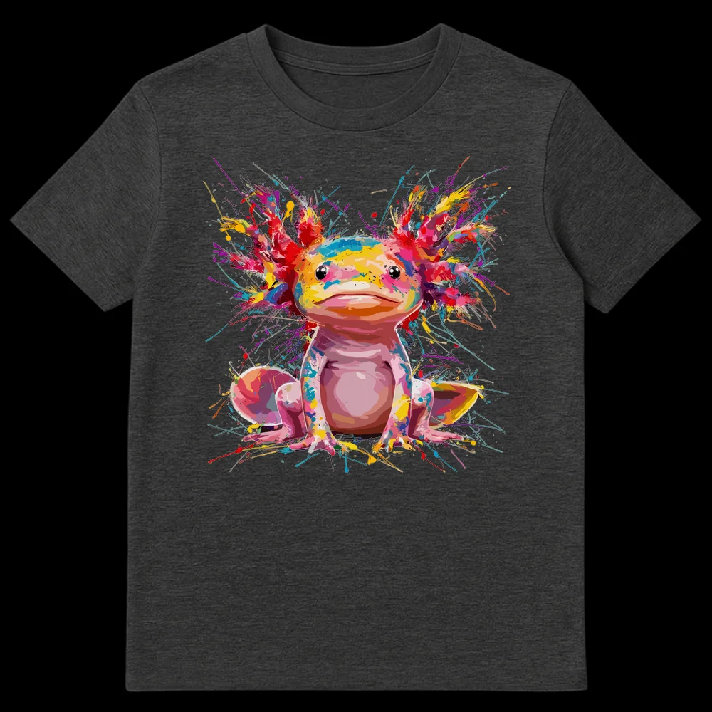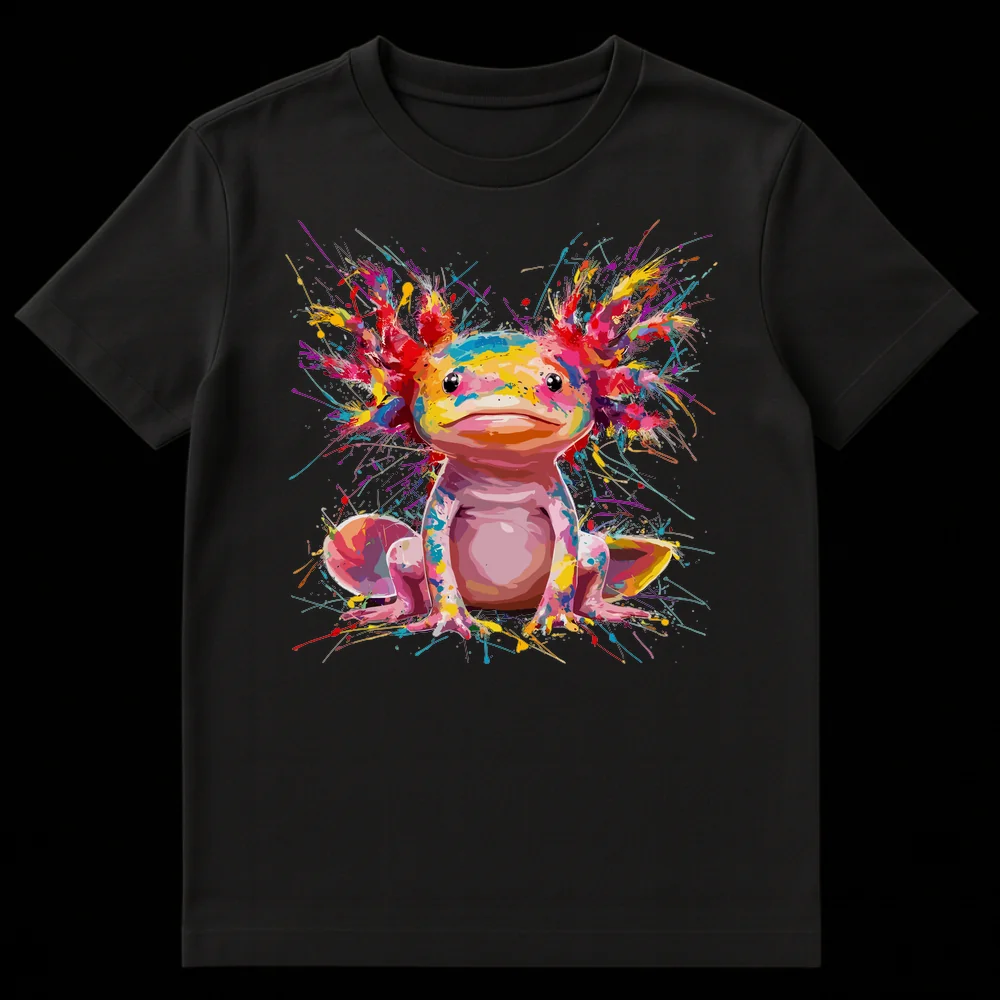 Dive into vibrant style with this unique t-shirt featuring a beloved axolotl rendered in energetic splash art. Against a stark black background, a charming axolotl comes to life with a kaleidoscope of pinks, blues, yellows, and greens. This eye-catching design celebrates the beauty of exotic amphibians and makes a perfect gift for axolotl owners, gamers, or anyone who loves unique, colorful animal art.