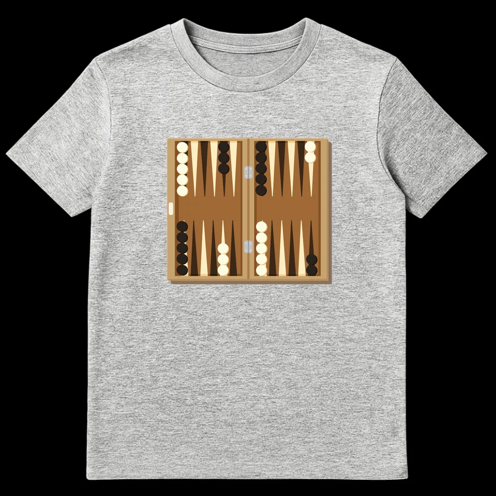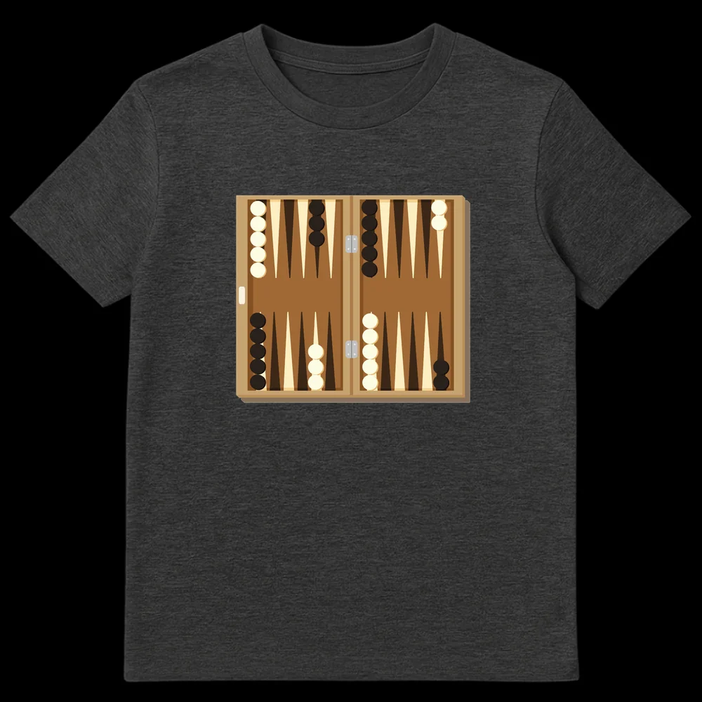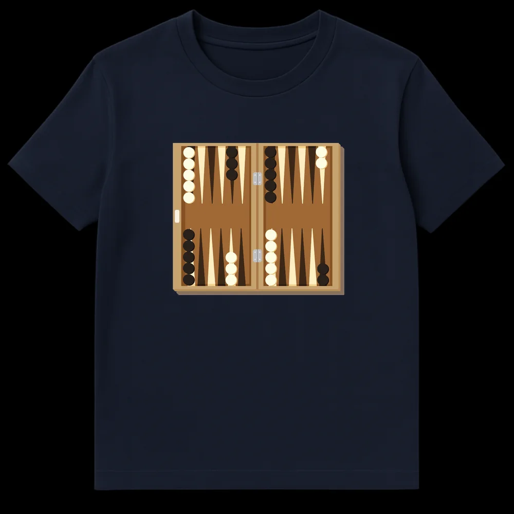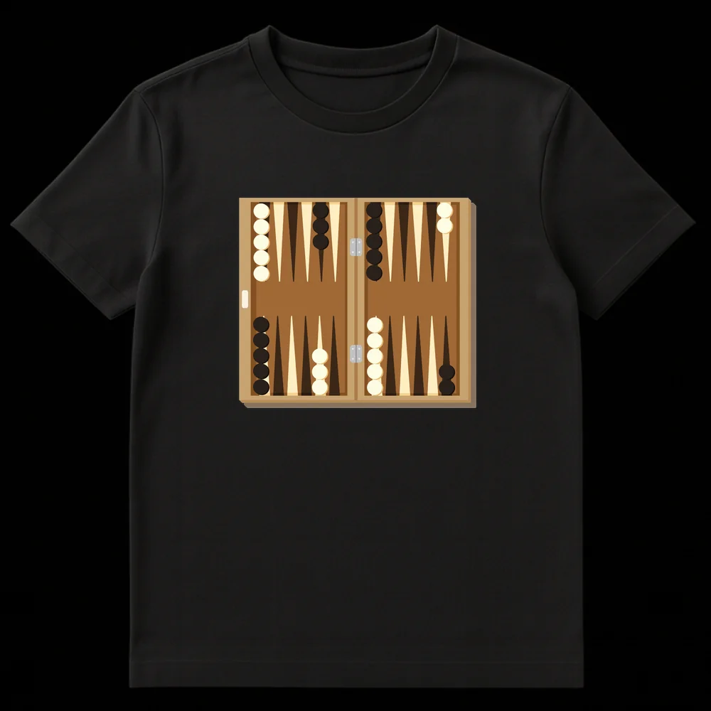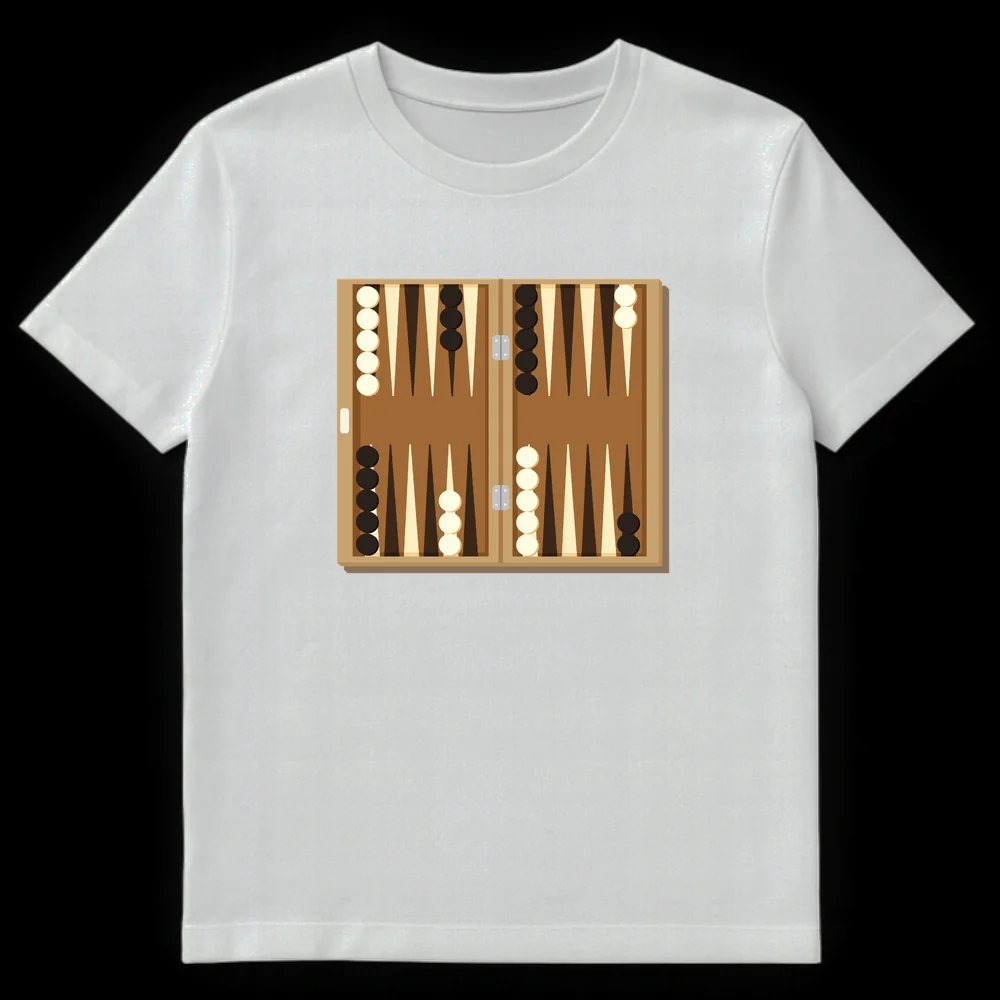 Show your love for the timeless strategy game with this elegant backgammon t-shirt. Featuring a crisp, flat illustration of an open backgammon board in its starting position, this design uses an earthy, sophisticated color palette. It’s a subtle nod to a classic pastime, perfect for game nights or casual wear. This shirt makes an ideal gift for any dedicated backgammon player or strategy game enthusiast.