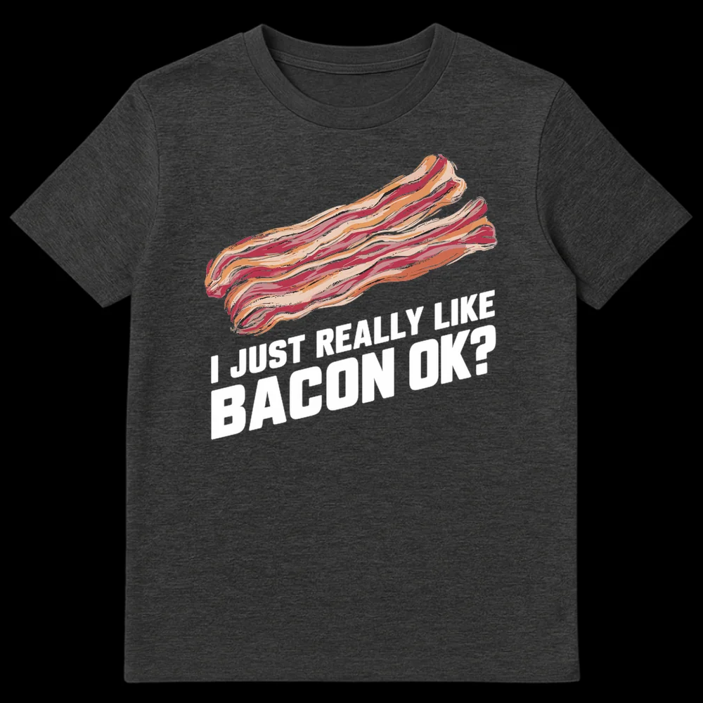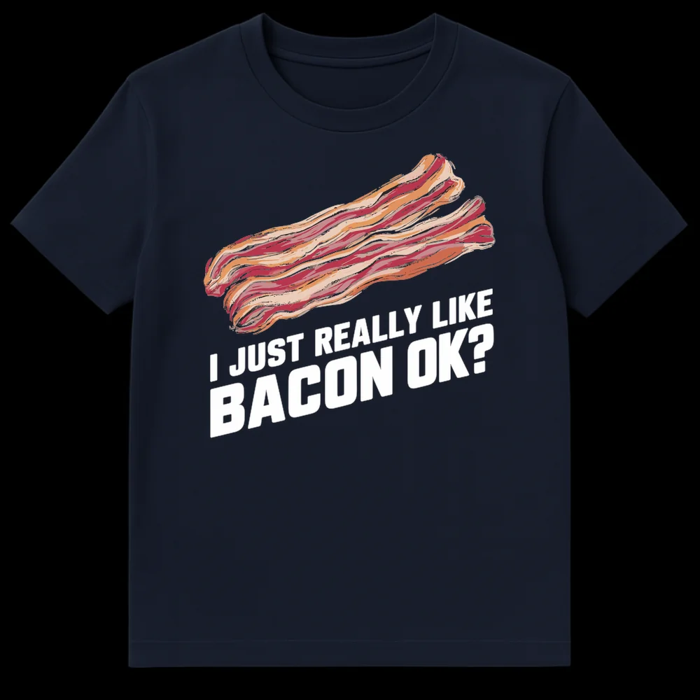 Unleash your inner bacon enthusiast with our unique “I JUST REALLY LIKE BACON OK?” t-shirt! This design brilliantly captures that universal, slightly exasperated devotion to everyone’s favorite crispy, salty treat. The front showcases a mouth-watering, stylized graphic of sizzling bacon, rendered with a dynamic, hand-drawn texture that brings it to life. Paired with strong, eye-catching typography, the text delivers a direct, humorous message that every bacon lover will instantly connect with. The subtle ‘OK?’ adds a playful, defiant edge, acknowledging the sheer joy of bacon without needing further justification. Crafted for comfort and style, this shirt is more than just apparel; it’s a badge of honor for anyone who understands the true magic of bacon. It makes an ideal gift for foodies, culinary adventurers, or anyone who enjoys funny food shirts that spark conversations and smiles. Wear your bacon pride!”